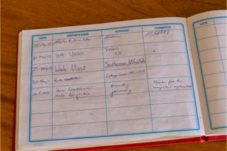 Peter hängt seine Schuhe als Andenken unters Campingbuch.
