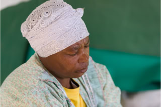 Südafrika 2014, Rhodes. Frauen beim Spinnen und Stricken, mit blütend weißem Turban oder ...