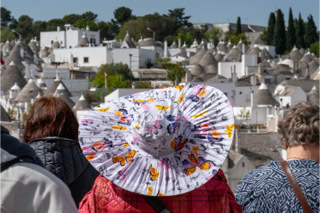 Italien 2017. Frau hat sich aufgehübscht für die Trulli von Alberobello.