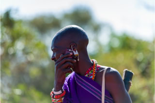 Kenia 2015. Auch in der Masai Mara ist bester Empfang - Austausch über die Sichtung einer Giraffe.