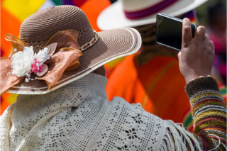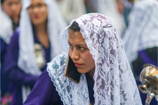 Peru 2019. Telefon unter Schleier bei der Prozession.