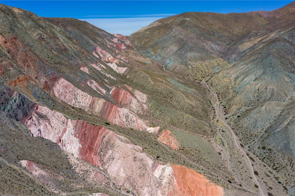 Rot, hellorange, dunkelorange, hellgrau, dunkelgrau, grün, schwarz und weiß - das sind die Farben der Berge hier, die einfach so rechts und links der Straße empor ragen! Alle paar Meter eine neue Kombination dieses Farbspektakels. Kann das eigentlich noch besser werden?
