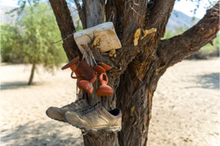 Peter hängt seine Schuhe als Andenken unters Campingbuch.