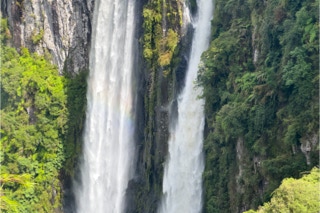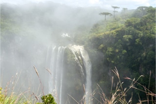 Auf dem Weg zum Nationalpark ist es genauso unspektakulär wie zu den acht kleinen Wasserfälle (vorhergehender Eintrag). Bis zum Parkeingang geht es durch Weideland, von unberührter Natur keine Spur. Im Park hingegen dürfen sich die Araukarien ausbreiten. Jeder Baum für sich eine Augenweide. Bis zur Abbruchkante der Canyons bestimmen sie das Bild, dann beginnt der „cloudy and mossy forest“. Dort ist es feucht und und die Niesel- und Nebelschwaden der Wasserfälle wabern umher. Wir haben die Wasserfälle nicht gezählt, aber man hat das Gefühl, dass im 5800 m langen Canyon alle fünfhundert Meter ein größerer und dazwischen kleine Wasserfälle 600 bis 720 m in die Tiefe stürzen. Als wir ankommen, will uns die Rangerin am Parkeingang partout kein Ticket verkaufen: „Heute seht ihr nichts!“. Wir hätten ja unser Haus dabei und könnten einen Tag warten. Der Tipp war Gold wert!