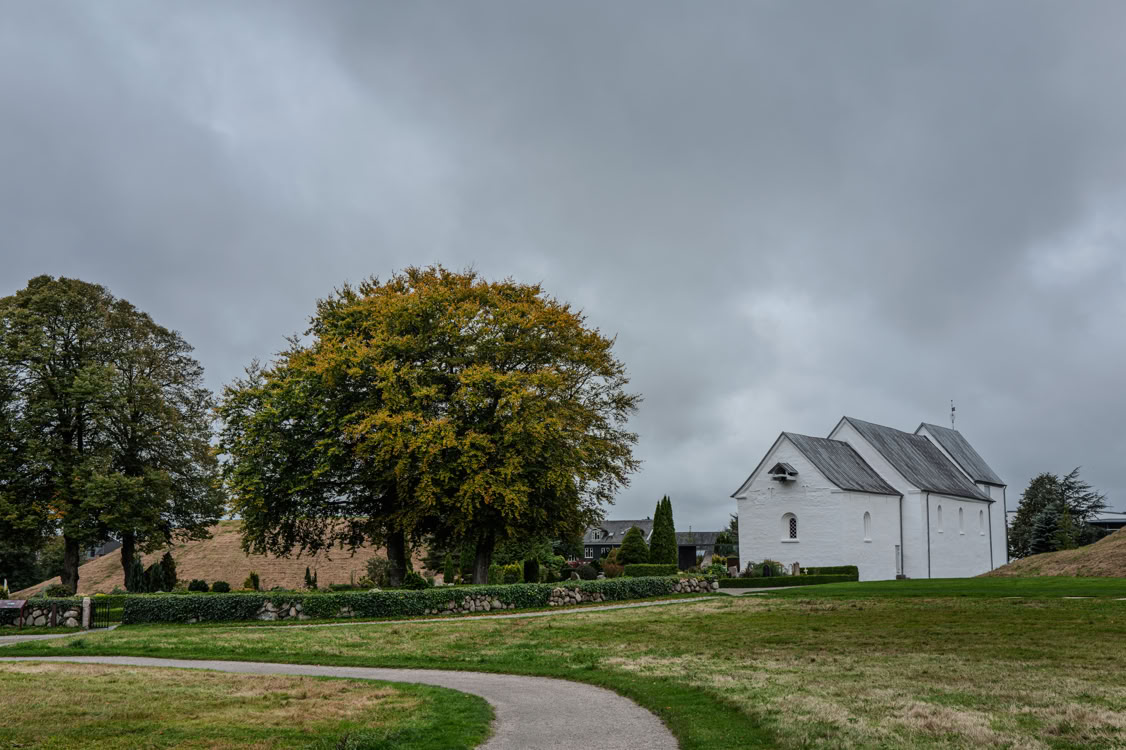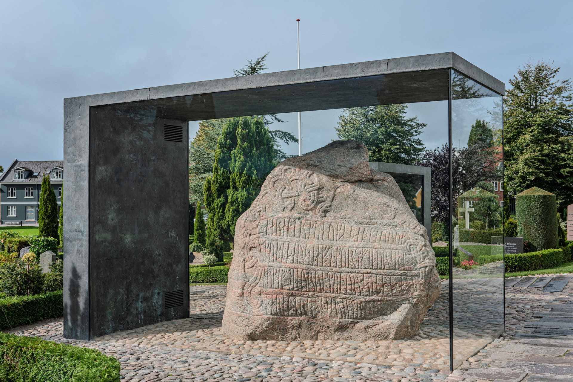 Die Steine liegen heute vor der Kirche von Jelling, die wiederum vor über 900 Jahren zwischen den zwei größten künstlich aufgeschütteten Grabhügeln Dänemarks errichtet wurde.