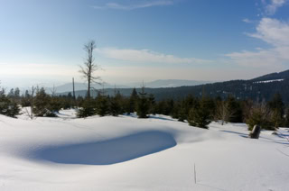 Eine taufrische Luchsspur hält uns auf unserer Schneeschuhwanderung um den Kleinen Arber in Atem. Den Schneekrümeln in der Spur nach zu urteilen - jeder Trapper würde uns recht geben - beobachtet der Luchs uns vom nächsten Busch aus. Abends berichtet uns ein Wanderer „Der Wolf ist zurück“. Er hat im Schachten-Gebiet sogar Wolfspuren gesehen.