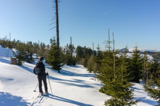 All unsere Wanderungen, Langlauftouren und Schneeschuhwanderungen haben wir diesmal dem Wander-Portal Outdoor Active entnommen und waren jeden Tag aufs Neue überrascht, denn wir dachten, man könne den Vortag nicht toppen. Absolut faszinierend war jedoch die Wanderung auf den Rachel. Ziemlich anstrengend, denn es wird ziemlich warm und der Schnee ziemlich sulzig, aber uns erwartet eine einmalige Landschaft und eine sagenhafte Aussicht. Vom Gipfel aus erkennen wir in 180 km Entfernung den Watzmann!