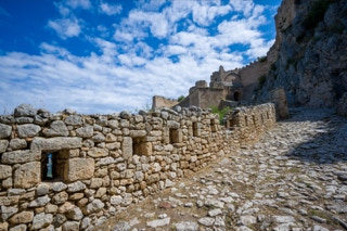 Wieder einmal bestätigt sich, so eine griechische Burganlage war und ist nichts für Unsportliche. Der Eingang zur Burg liegt schon 300 m über dem Antiken Korinth, der höchste Punkt auf 575 m. Diese Höhe legen heute nur noch ein paar Sportler zu Fuß zurück, die meisten lassen sich mit dem Taxi direkt vor das Burgtor fahren und drehen eine kleine Runde durch die Ruinen. Auch wir fahren mit Rosinante zur Burg hinauf und übernachten auf dem Vorhof mit herrlichem Ausblick. Am nächsten Morgen erkunden wir die Burg mit ihren drei Ringwällen, die immerhin drei Kilometer lang sind. Peter ist sich aber auch ganz sicher, dass man den Isthmus von hier oben erspähen kann. Wir müssen nur hoch genug hinauf steigen - auf die schon erwähnten 575 m!