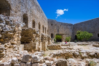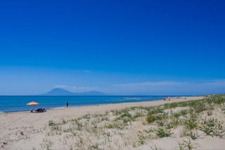Wanderung: Camping Melissa - Burg Chlemoutsi - Schwefelquelle Loutra Killinis - am Strand zurück zum Campingplatz. 15 km, 270 hm, 25°. Auch eine Schlange hält Siesta und hört die Vibration unserer Schritte nicht. Sie ergreift allerdings nicht schlängelnd die Flucht, sondern springt ins Gebüsch! War das vielleicht die berüchtigte Peloponnes-Mamba?