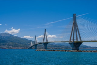 Wir meiden die neumodische Brücke, sondern nehmen die altmodische Fähre von Andirio nach Patras ,um auf den Peleponnes zu kommen. Und zwar, um den gigantischen Blick auf die Brücke und nicht von der Brücke genießen zu können.