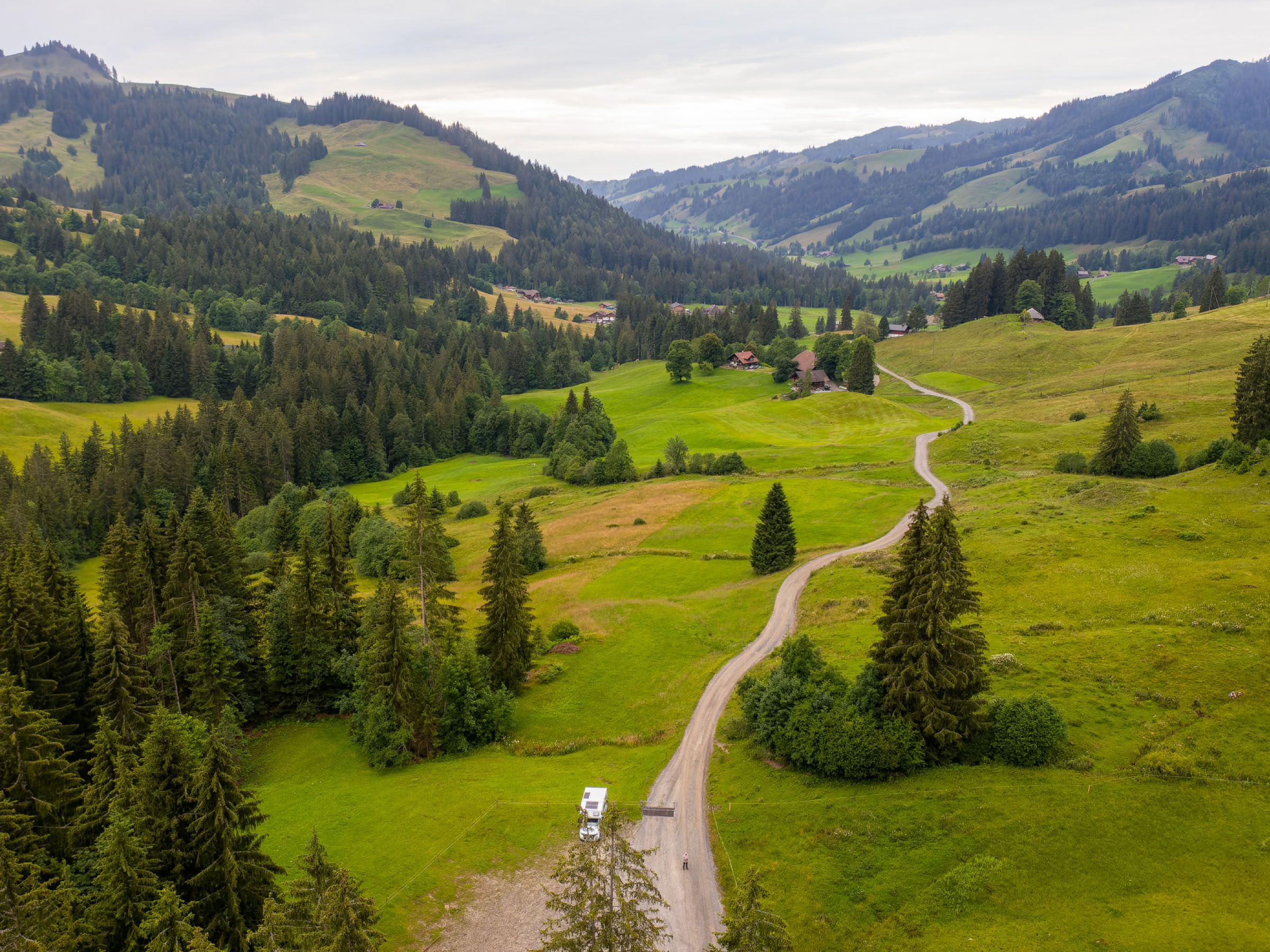 Abends am Ende der Welt, zum Beispiel auf dem Parkplatz bei der Alpe Drüschhübel im hinteren Eriztal, sind wir wieder für uns allein. Ganz allein vier Tage lang. Bis 22 Uhr rumpeln noch ein paar Autos über das Kuhgitter zu den weiter entfernt gelegenen Alpen, dann kehrt eine himmlische Ruhe ein.