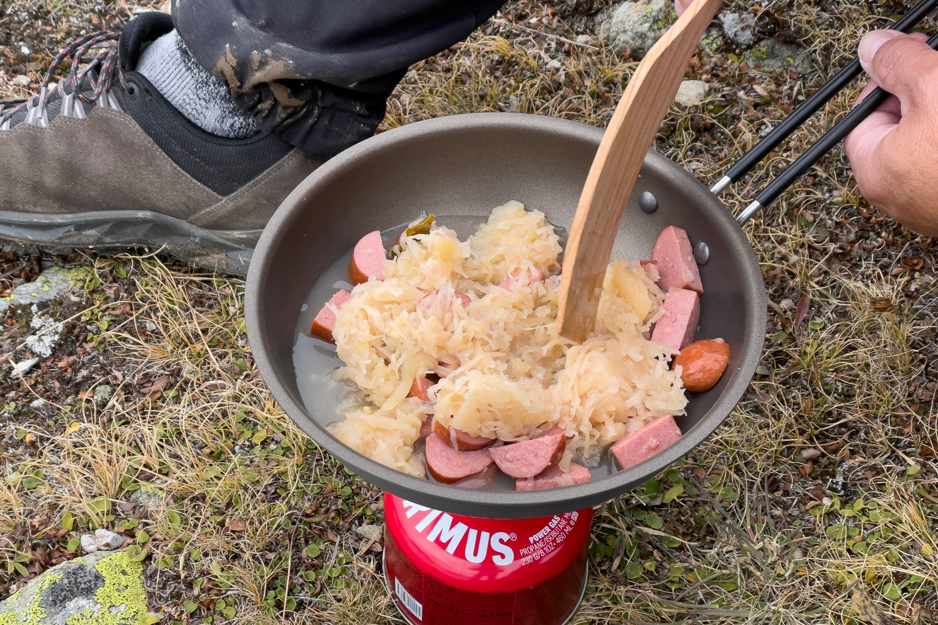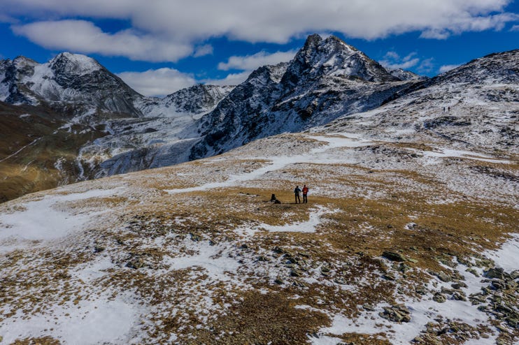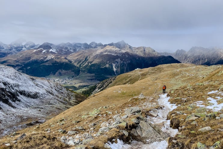 Wir starten für eine mehrtägige Hüttentour in La Punt Chamues-ch im Unterengadin. 19 Kilometer und 1200 Höhenmeter sind es bis zur ersten Übernachtung auf Muottas Muragl. Ich habe unglaublichen Respekt vor dieser langen Etappe. Erst nach Überschreitung des Passes Fuorcla Muragl, circa eine Stunde vor unserem Ziel, kann ich mich am Lej Muragl auf eine ordentliche Pause mit Sprung ins kalte Nass einlassen. Im Berggasthof gibt es damals nur einfachste Zimmer mit Stockbetten und Etagendusche und gerade soviel Platz, dass man zwei Rucksäcke vors Bett stellen kann. Beim Einchecken werden wir gefragt, ob wir im Restaurant essen wollen, sie hätten auch noch einen Tisch am Fenster. Klar! Frisch geduscht in kariertem Wanderlook - Peter mit Frottee-Schläppchen von der Lufthansa - spazieren wir an unseren Platz mit gigantischer Aussicht.