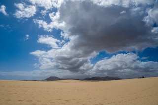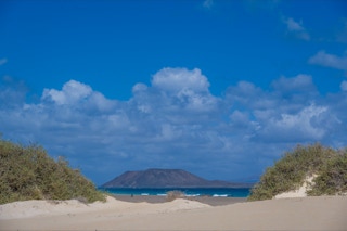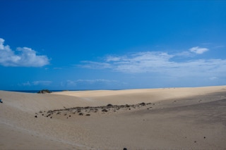 Man fühlt sich gleich ein bisschen nach Afrika versetzt - und man ist ja auch in Afrika. Der Parque Natural de Corralejo ist das größte Dünengebiet der Kanarischen Inseln. Weiße Dünen zwischen rotem Vulkangebirge und blauem Meer. Eine wirklich fotogene Landschaft.