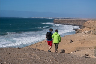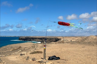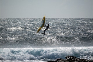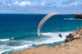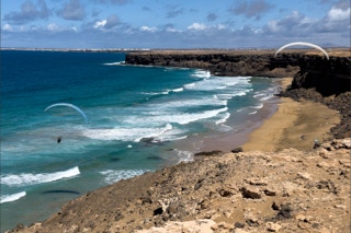 Gleich südlich von El Cotillo schließt sich eine bizarre Steilküste an. Mal ragen die steilen schwarzen Wände direkt bis ins Meer, mal geben sie gerade noch Platz für kleine helle Sandbuchten. Ein herrliches Surfergebiet. Wir sind ja nicht vom Fach, aber jede Bucht scheint ihre besondere Surfcharakteristik zu haben: die eine ist von Kitesurfern besiedelt, die nächste von Wellenreitern, die übernächste von Wing-Surfern und dann gibt es noch die altmodischen „echten“ Surfern. Am letzten Tag kommen dann noch Paraglider hinzu, die die Abbruchkante entlang tanzen. Was ist jetzt spannender? Den Wellen oder den Surfern zuzusehen.