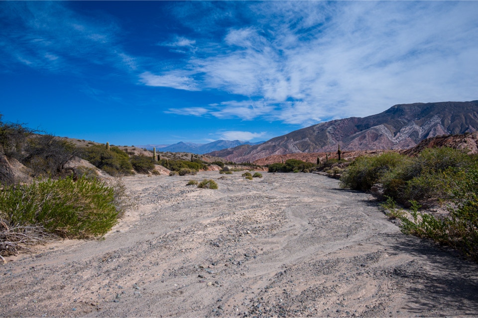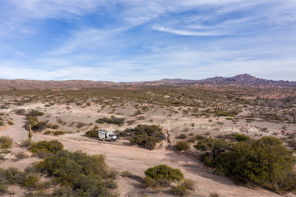 Traumhaft abgeschieden ist dieser Übernachtungsplatz in einem ausgetrockneten Flusstal auf dem Weg nach Cachi. Nur Lamas finden ohne die App iOverlander hierher. Sie haben uns einiges voraus.