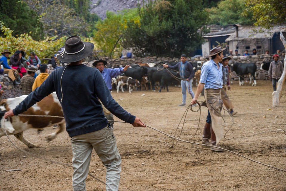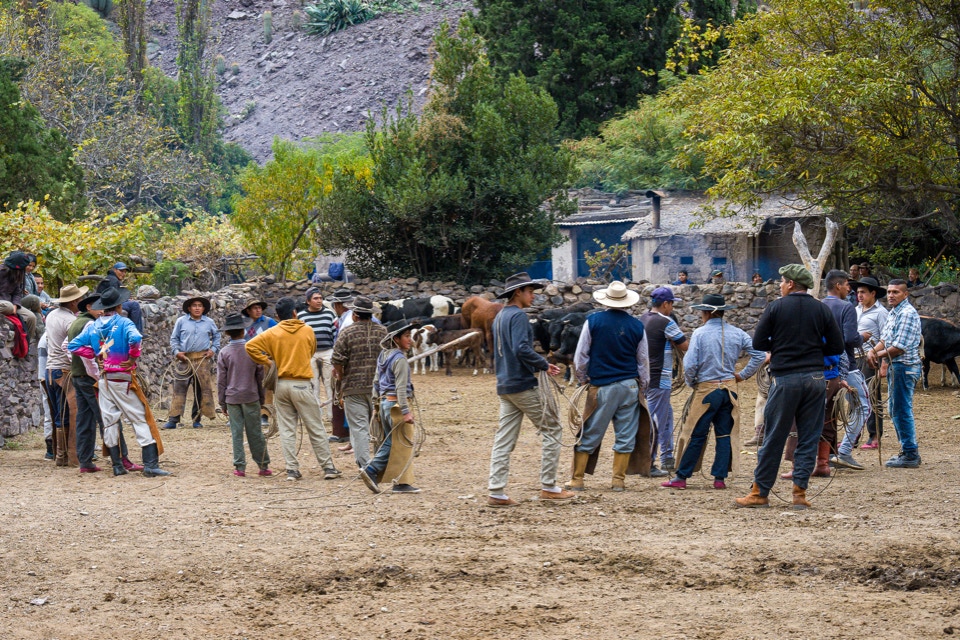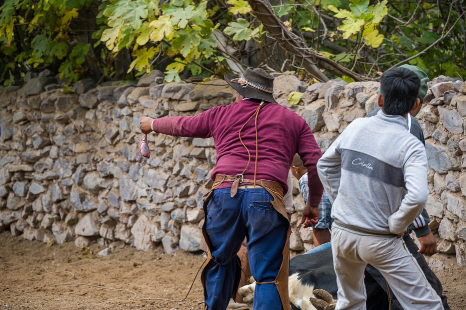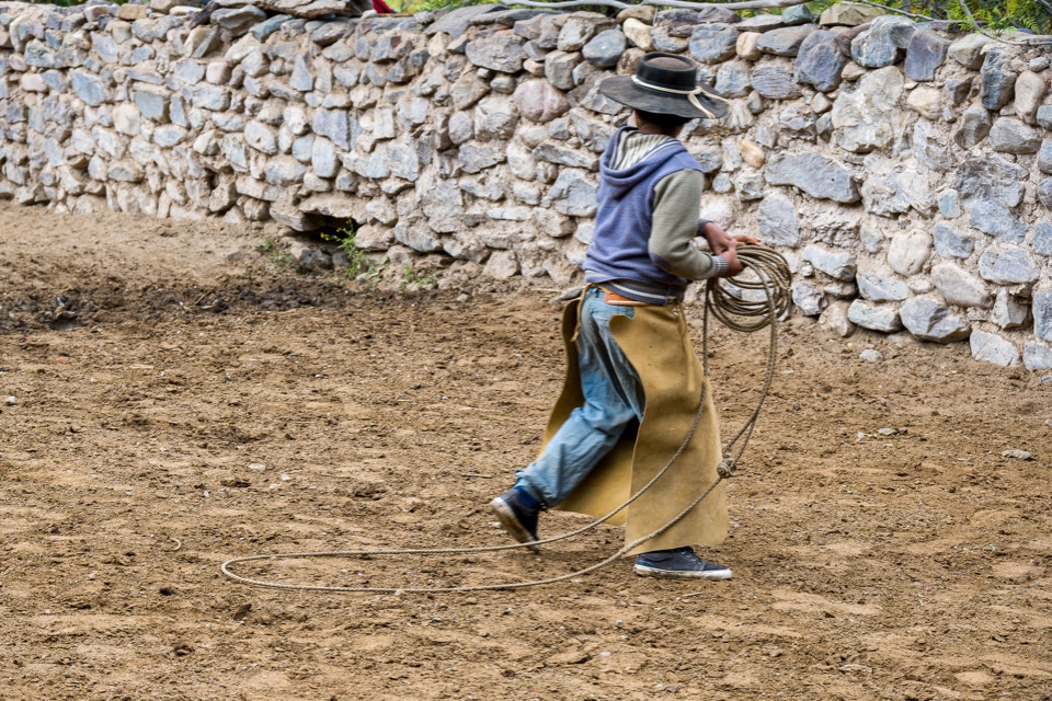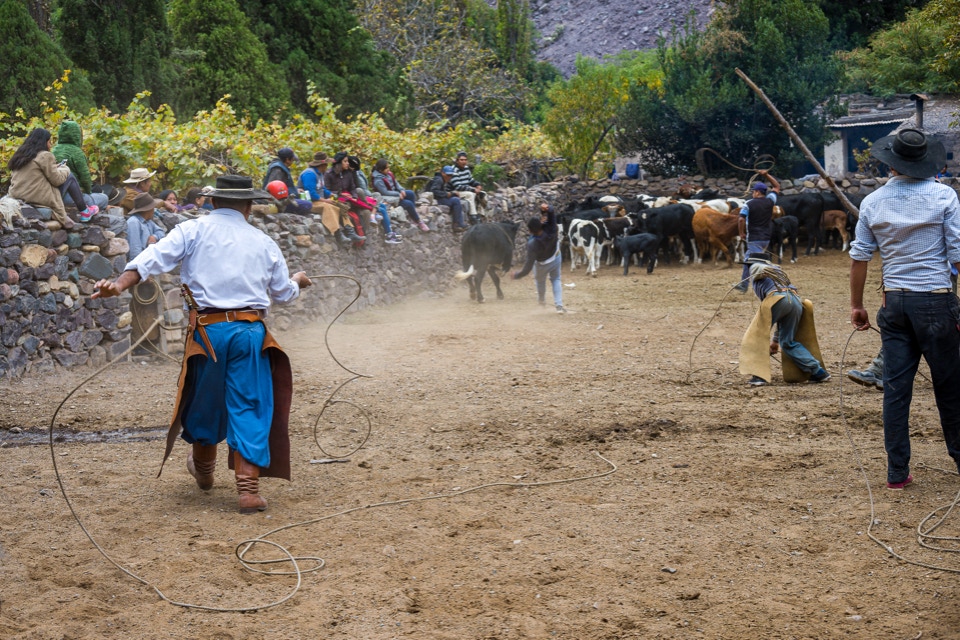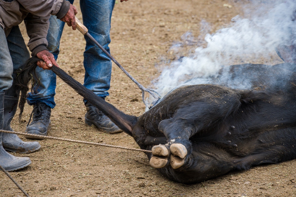 Den Gauchos bleibt nichts anderes übrig, als eine Truppe Treiber auszugucken, die die Rinder im Karree herum jagen müssen. Die anderen dürfen sich im Lasso werfen versuchen. Hat man ein Tier endlich zu Fall gebracht, geht man so richtig zur Sache: den männlichen Tiere wird ein Trunk zum Benebeln (?) eingeflößt. Dann werden sie mit dem Messer kastriert. Der Samenstrang wird herausgezogen und ist gern mal einen Meter lang. Die „Balls“ landen im Eimer. Ob man damit wohl abends ein Festmahl zubereitet oder ob sie als Aphrodisiakum in Asien landen? Den weiblichen und jungen Tiere wird ein Brandzeichen aufgedrückt. Seltsam ist, kein Tier schreit. Sie sind wie paralysiert.