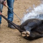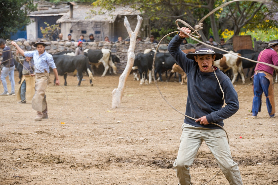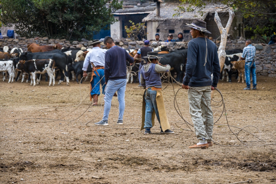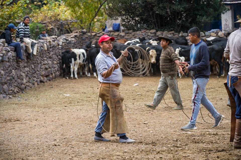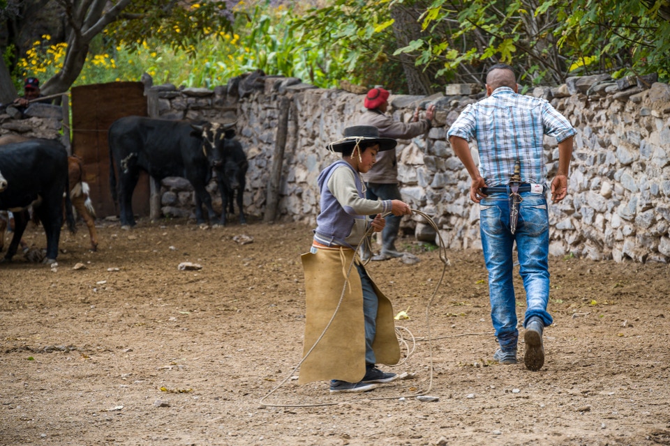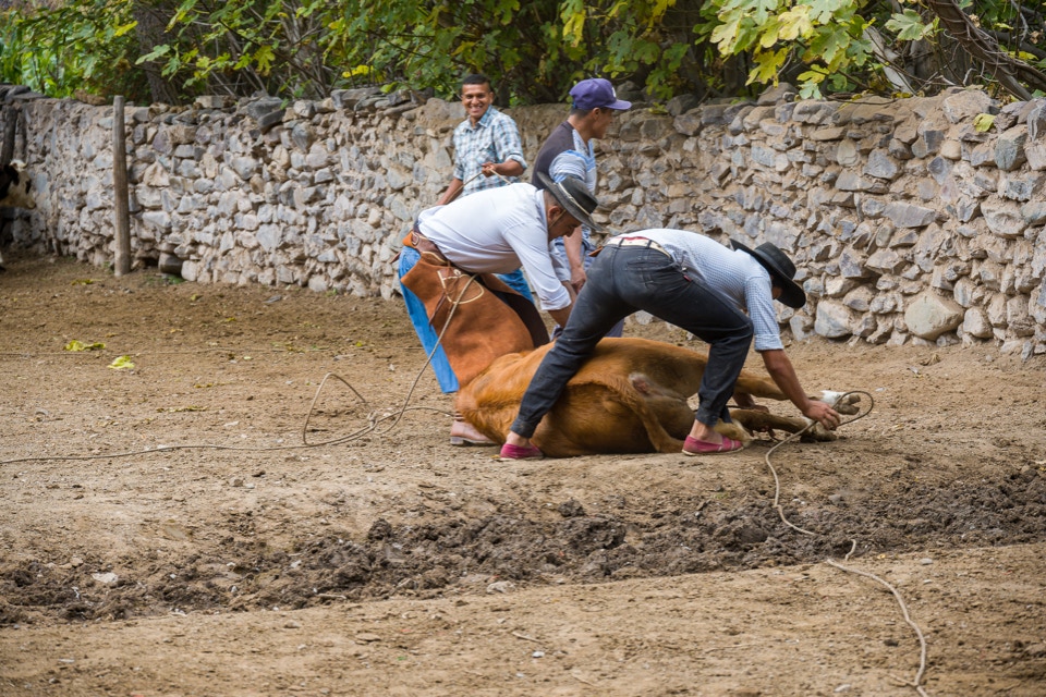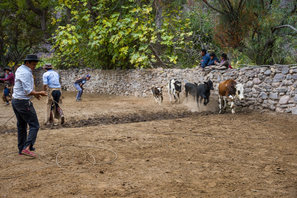 Den Gauchos bleibt nichts anderes übrig, als eine Truppe Treiber auszugucken, die die Rinder im Karree herum jagen müssen. Die anderen dürfen sich im Lasso werfen versuchen. Hat man ein Tier endlich zu Fall gebracht, geht man so richtig zur Sache: den männlichen Tiere wird ein Trunk zum Benebeln (?) eingeflößt. Dann werden sie mit dem Messer kastriert. Der Samenstrang wird herausgezogen und ist gern mal einen Meter lang. Die „Balls“ landen im Eimer. Ob man damit wohl abends ein Festmahl zubereitet oder ob sie als Aphrodisiakum in Asien landen? Den weiblichen und jungen Tiere wird ein Brandzeichen aufgedrückt. Seltsam ist, kein Tier schreit. Sie sind wie paralysiert.