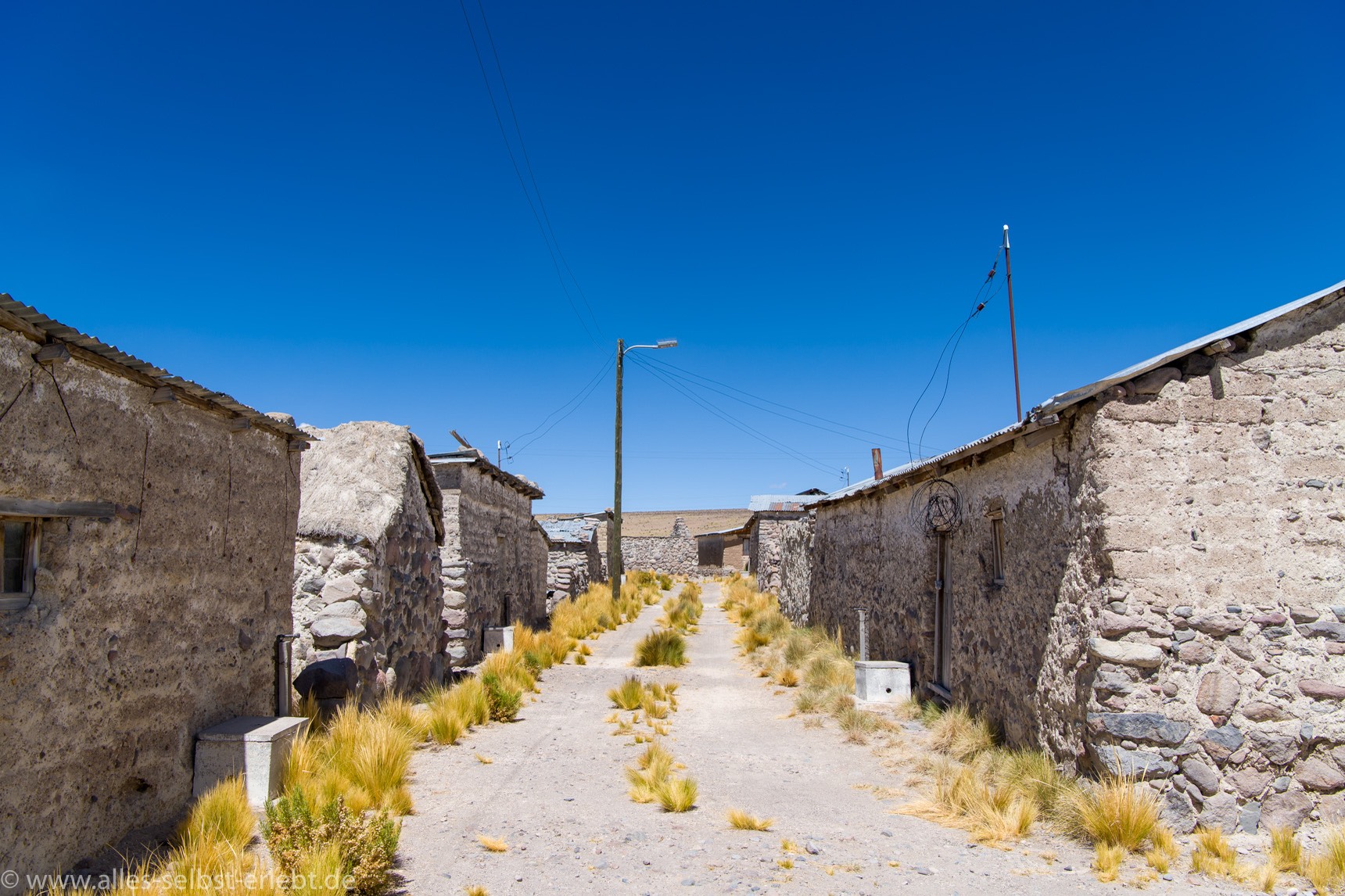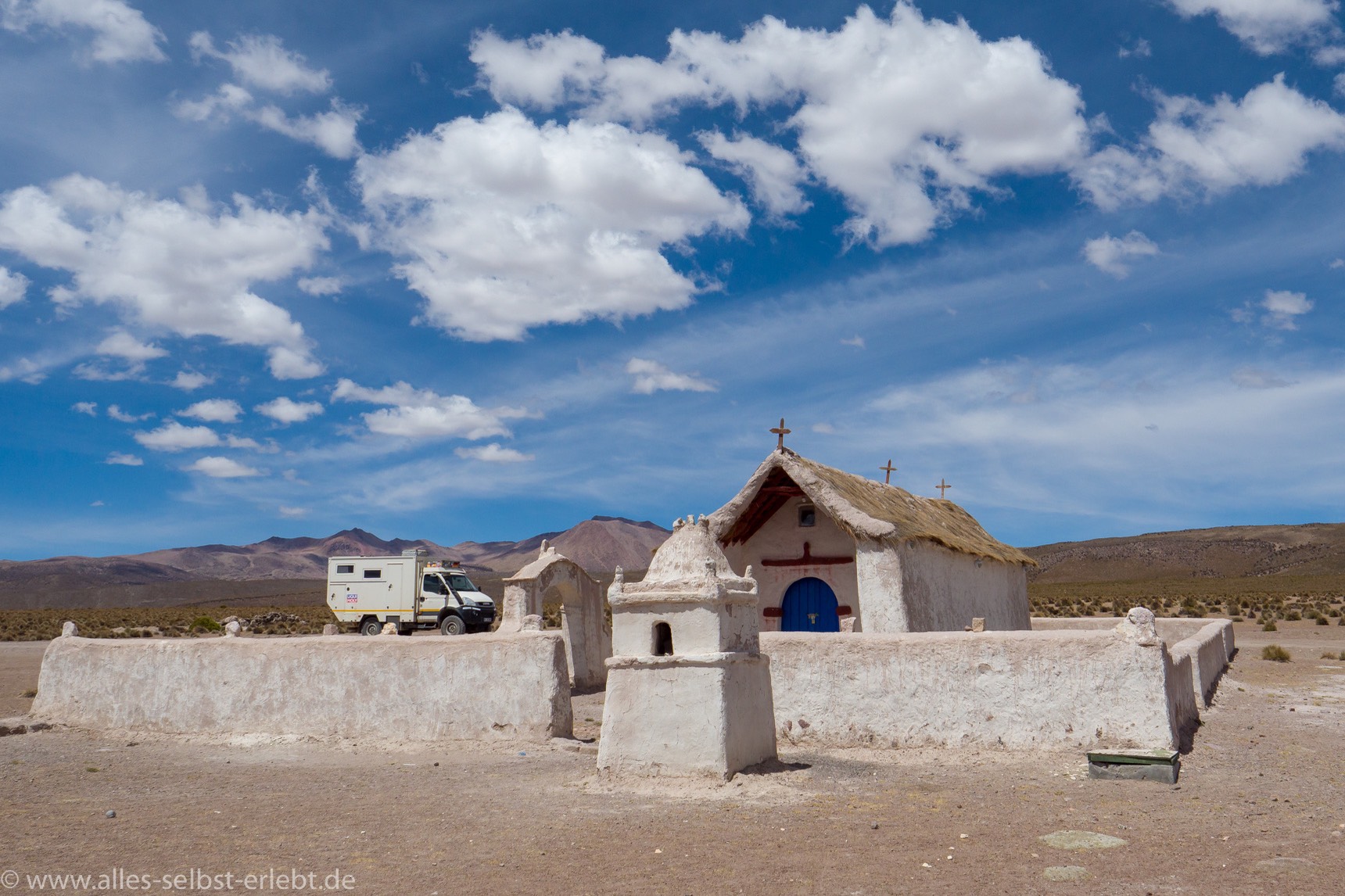 Aber man soll nichts überstürzen. Im fast verlassenen Dörfchen Guallatire - wir schätzen fünf Einwohner, zwei Polizisten, zwei Nationalpark-Ranger - schauen wir uns die Kirche an, tanken Wasser am Kirchplatz und essen bei der Aymará-Mutti zusammen mit einigen Truckern eine unglaublich leckere Alpaka-Suppe mit Kartoffeln, Reis und vielen frischen Gewürzen. Nur die Kirche ist im Reiseführer erwähnt, Wasser und Suppe haben wir iOverlander zu verdanken.