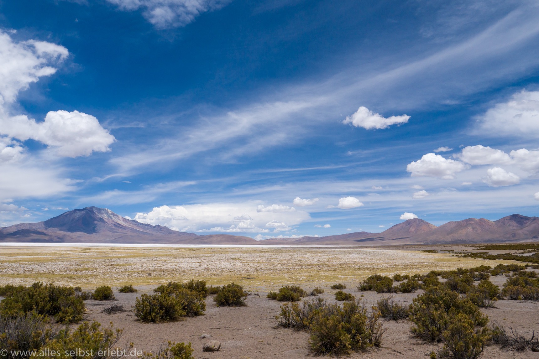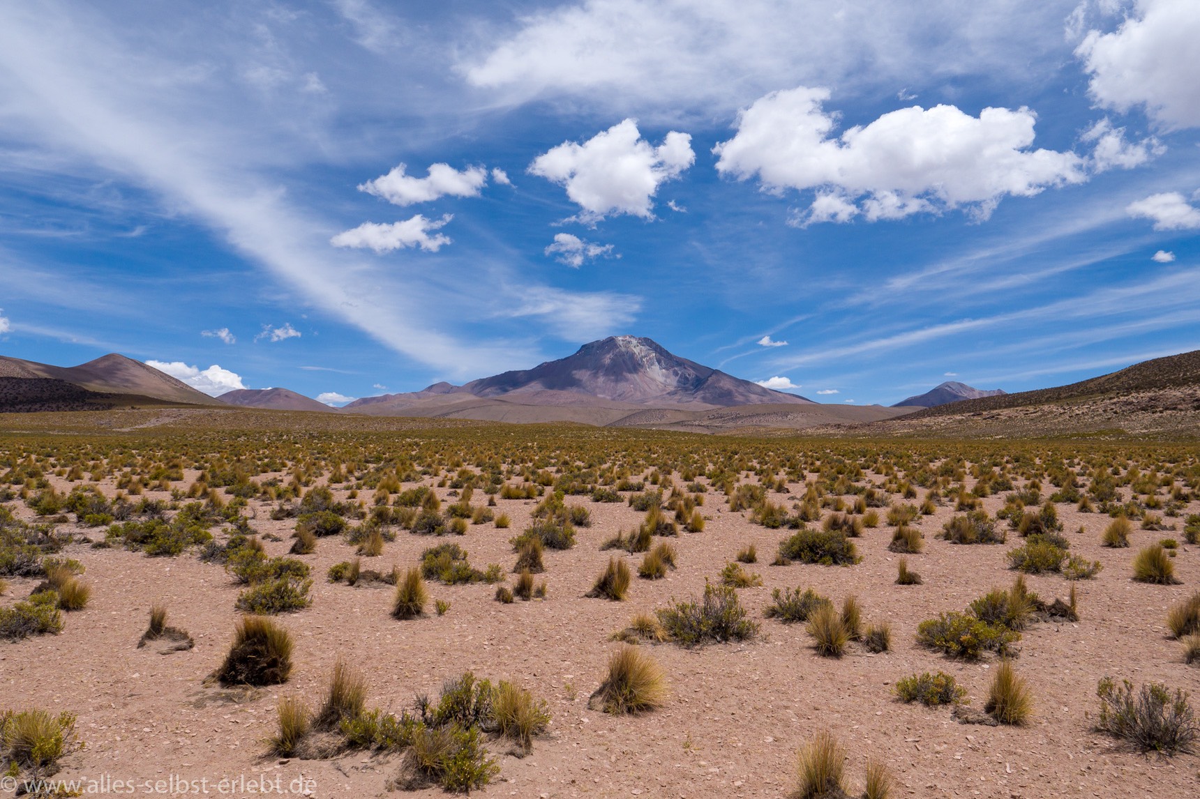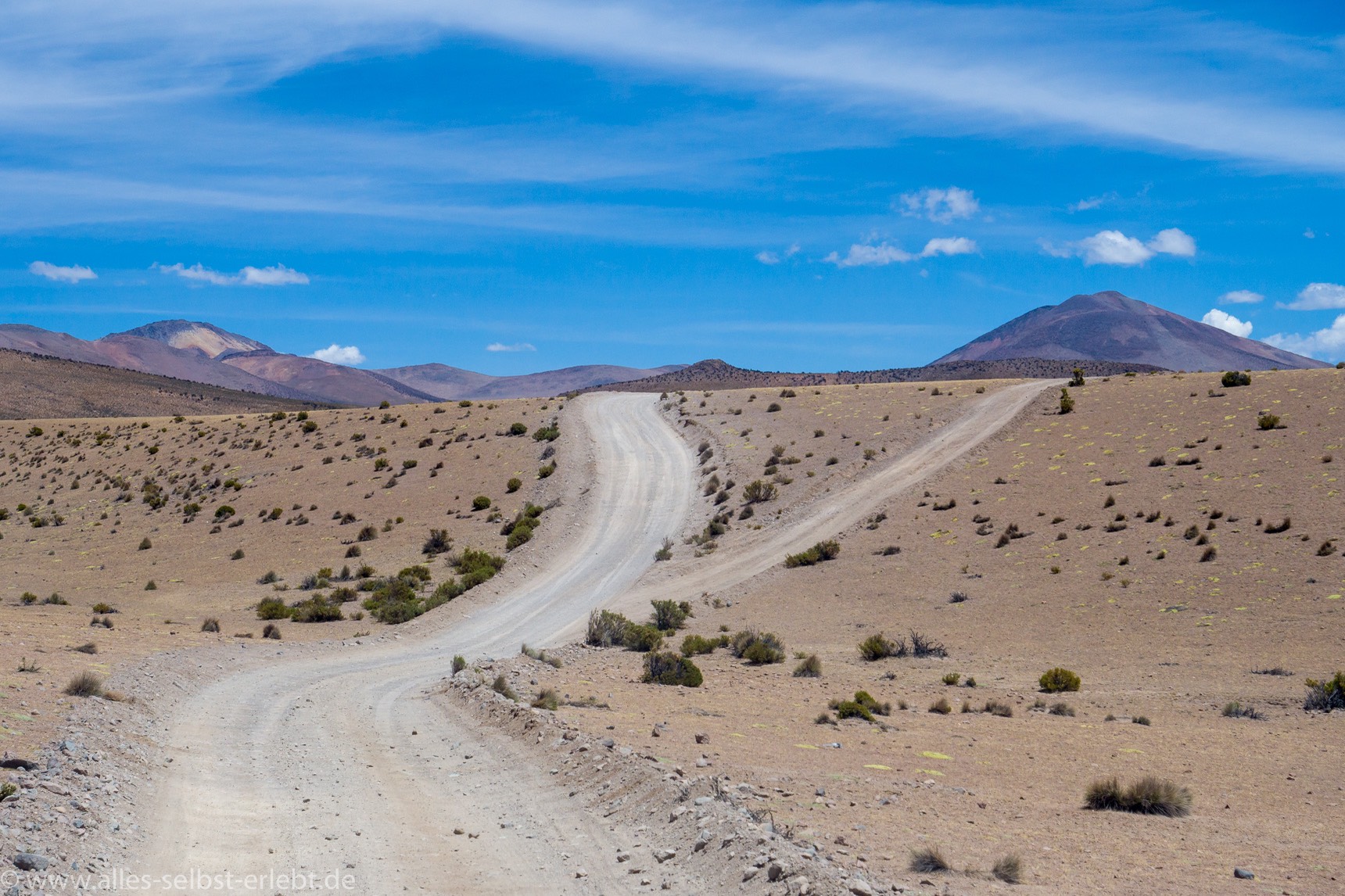 Heute fahren wir 150 km Schotterpiste, teilweise so langsam, dass uns unsere eigene Staubwolke überholt. Aber das nehmen wir gerne in Kauf, wir werden mit gigantischen Blicken auf die Anden-Bergwelt mit schneebedeckten Vulkanen, auf die blendende Salzebene Salar de Surire und nicht zuletzt mit einem Sitzbad im dampfenden Thermalpool der Termas de Pollequere belohnt. Wir kommen also unserem Versprechen nach, ab sofort nur noch über 4000 m in heißen Termalpools zu baden…
