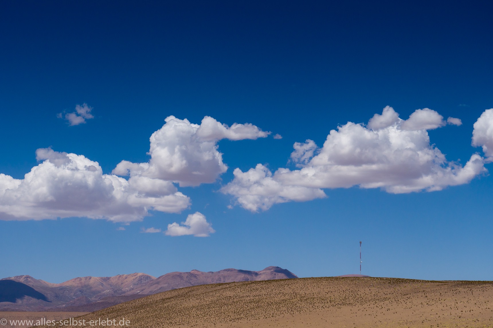 Am nächsten Tag ändern wir spontan unsere Planung. Statt über den Nationalpark Lauca nach Putre weiter zu fahren, fahren wir direkt nach dorthin. Grund sind sich auftürmende Gewitterwolken, die von Bolivien über die Anden ziehen. Dass gegen Nachmittag die Wolken aufziehen, beobachten wir zwar schon seit drei Tagen, aber heute sind die Wolkentürme besonders dunkel, wir sehen Blitze und der Donner rollt über den Altiplano. So etwas haben wir noch nie gehört - wir denken zunächst an eine Sprengung oder poltern die Aymará-Götter etwa heute ? Auf alle Fälle unheimlich!
