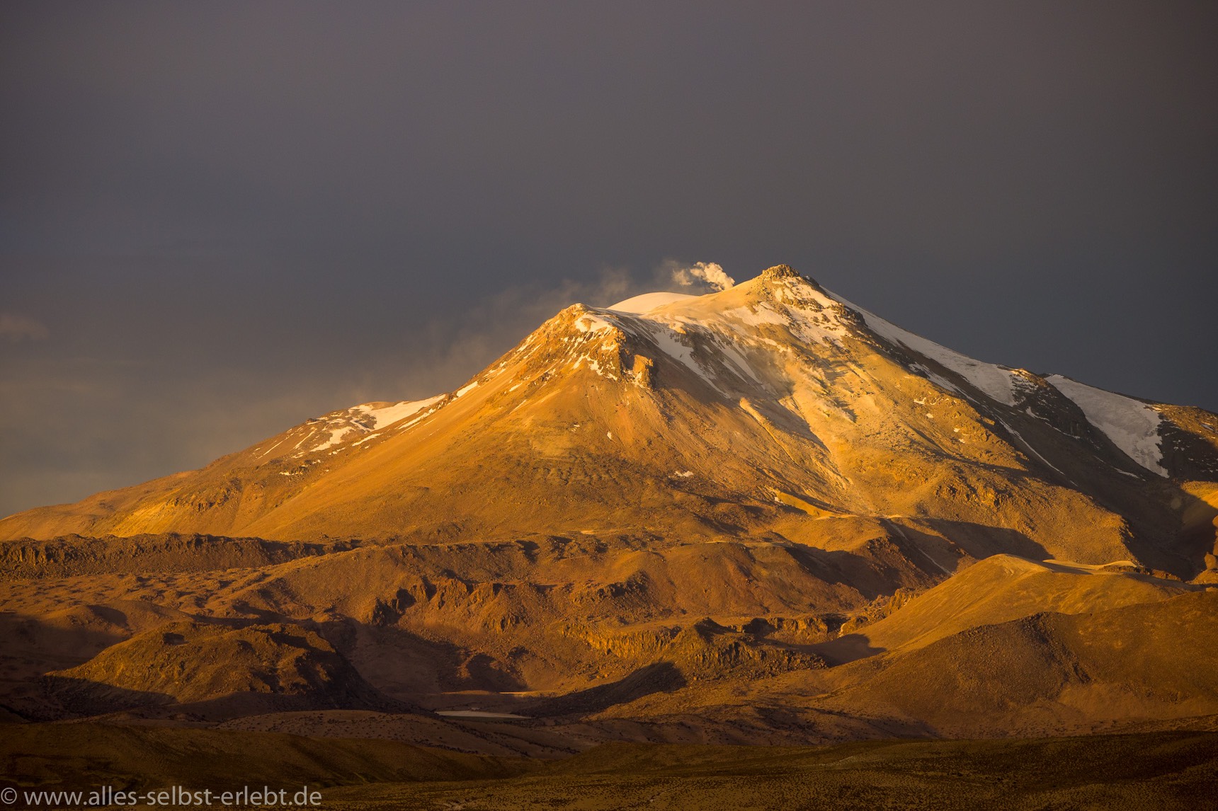 Die Rauchfahne des Vulkans Guallatiri sieht man vom gleichnamigen Dorf. Dort gibt es auf Wachstuch und Plastikdecke eine Alpaka-Suppe.