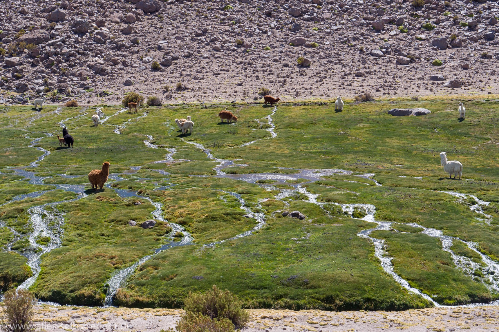 Blendend im wahrsten Sinne des Wortes liegt der Salar de Surire vor uns. Die Thermalquellen dampfen, nicht weil es außen so kalt wäre, sondern weil sie so heiß sind. Man muss sich eine kühle Ecke für sein Sitzbad aussuchen.