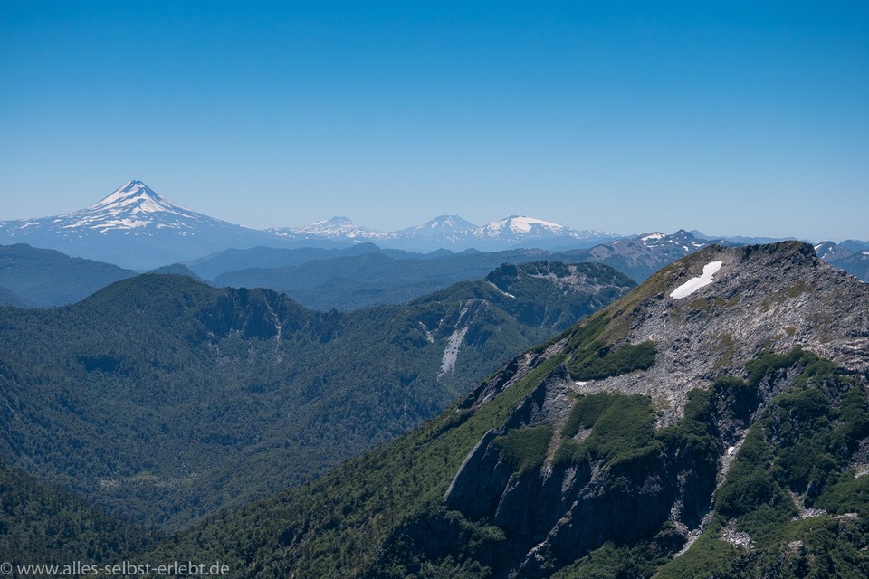 So viele Overlander können nicht irren - denken wir und fahren den Empfehlungen hinterher in den Nationalpark Huerquehue, 35 km nordöstlich von Pucón. Vor allem locken uns die Beschreibungen der Wanderung auf den Cerro San Sebastian: 360°-Rundblick, zehn Vulkane (sehen wir nicht sogar noch mehr?), eine ganze Kette von Bergseen tief unter uns, modernde Urwaldriesen, Araukarienwälder in frischem Grün. Allerdings auch 1200 Höhenmeter bei 32° und praller Sonne auf staubigen, knochentrockenen Wegen. Wir kriechen durch sperriges Südbuchen-Unterholz, erreichen die Baumgrenze und mit viel Gekraxel über Stock und Stein geht es dem Gipfel entgegen. Uff, wir sind wahrlich geschafft. Schweiß und Staub haben sich zu einer dunklen Kruste vermischt. Am Gipfel legen wir eine lange Pause ein, genießen den freien Blick in alle vier Himmelsrichtungen und stärken uns mit einem feudalen Picknick aus dem Rucksack. Nur das Wasser ist bei dieser Hitze etwas knapp. Der Rückweg ist heute auch anstrengender als normal und nach einem erfrischendem Bad in „unserem“ Bergsee können wir besonders schnell einschlafen.