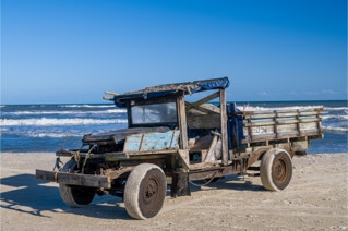 Fünf Kilometer fährt man zum Praia do Farol über den Strand. Aber kaum jemand findet den Weg bis auf ein paar Fischer mit Holzauto …
