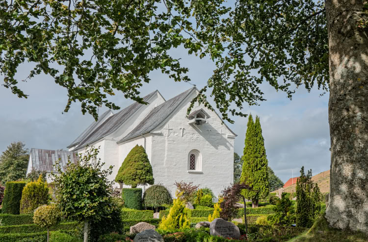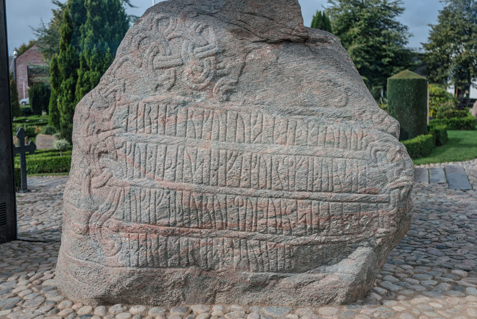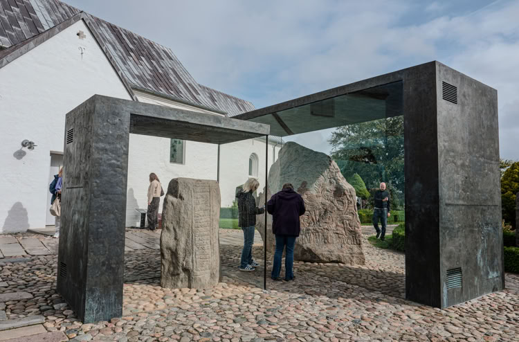 Die Steine liegen heute vor der Kirche von Jelling, die wiederum vor über 900 Jahren zwischen den zwei größten künstlich aufgeschütteten Grabhügeln Dänemarks errichtet wurde.