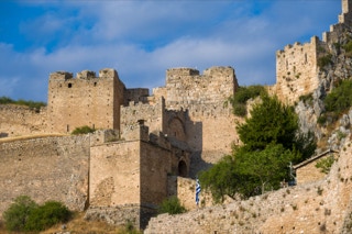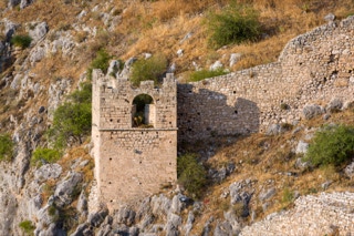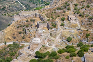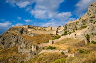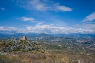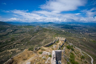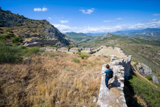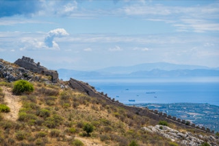 Wieder einmal bestätigt sich, so eine griechische Burganlage war und ist nichts für Unsportliche. Der Eingang zur Burg liegt schon 300 m über dem Antiken Korinth, der höchste Punkt auf 575 m. Diese Höhe legen heute nur noch ein paar Sportler zu Fuß zurück, die meisten lassen sich mit dem Taxi direkt vor das Burgtor fahren und drehen eine kleine Runde durch die Ruinen. Auch wir fahren mit Rosinante zur Burg hinauf und übernachten auf dem Vorhof mit herrlichem Ausblick. Am nächsten Morgen erkunden wir die Burg mit ihren drei Ringwällen, die immerhin drei Kilometer lang sind. Peter ist sich aber auch ganz sicher, dass man den Isthmus von hier oben erspähen kann. Wir müssen nur hoch genug hinauf steigen - auf die schon erwähnten 575 m!
