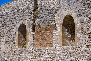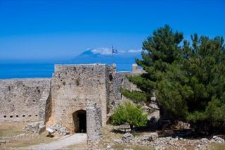 Wanderung: Camping Melissa - Burg Chlemoutsi - Schwefelquelle Loutra Killinis - am Strand zurück zum Campingplatz. 15 km, 270 hm, 25°. Auch eine Schlange hält Siesta und hört die Vibration unserer Schritte nicht. Sie ergreift allerdings nicht schlängelnd die Flucht, sondern springt ins Gebüsch! War das vielleicht die berüchtigte Peloponnes-Mamba?