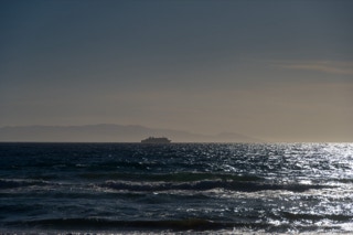 Wir meiden die neumodische Brücke, sondern nehmen die altmodische Fähre von Andirio nach Patras ,um auf den Peleponnes zu kommen. Und zwar, um den gigantischen Blick auf die Brücke und nicht von der Brücke genießen zu können.