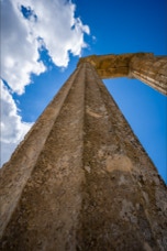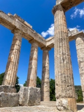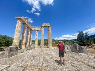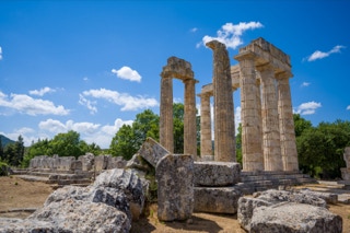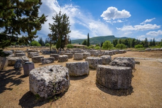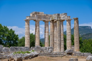 Die Spiele und den Tempel widmete Herakles seinem Vater Zeus, nachdem er den Nemeischen Löwen erwürgt hatte. Das ist eine Version der Gründung Nemeas, deren Zeitachse nicht so ganz mit der Realität übereinstimmt. Aber das spielt bei griechischen Mythen keine besonders große Rolle. Der Zeustempel ist auch mit den wenigen Säulen einer der beeindruckendsten seiner Art. Weitere Säulen warten aber noch auf ihre Restaurierung und bei einer Restaurierungsdauer von drei bis vier Jahren für eine Säule lässt die Fertigstellung des Gesamtkunstwerks noch etwas auf sich warten.
