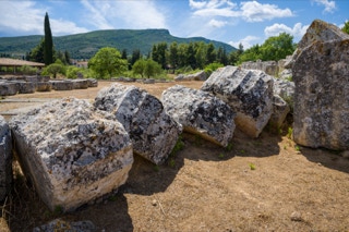 Die Segmente einer umgefallenen Säule liegen noch aufgereiht vor dem Zeustempel - sie warten wohl auf den Wiederaufbau.