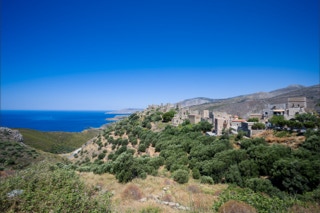 Vathia gleicht einer Geisterstadt. Die meisten Häuser sind verfallen. Offensichtlich gibt es außerhalb der Corona-Zeit ein Hotel und eine Taverne, aber im Moment ist alles geschlossen und nur genau ein weiteres Besucherpärchen in den leeren Gassen auszumachen. Vor einem Haus mit Meerblick ist die Treppe noch nass vom Putzen und es steht ein Moped davor. Es gibt also mindestens einen Einwohner.