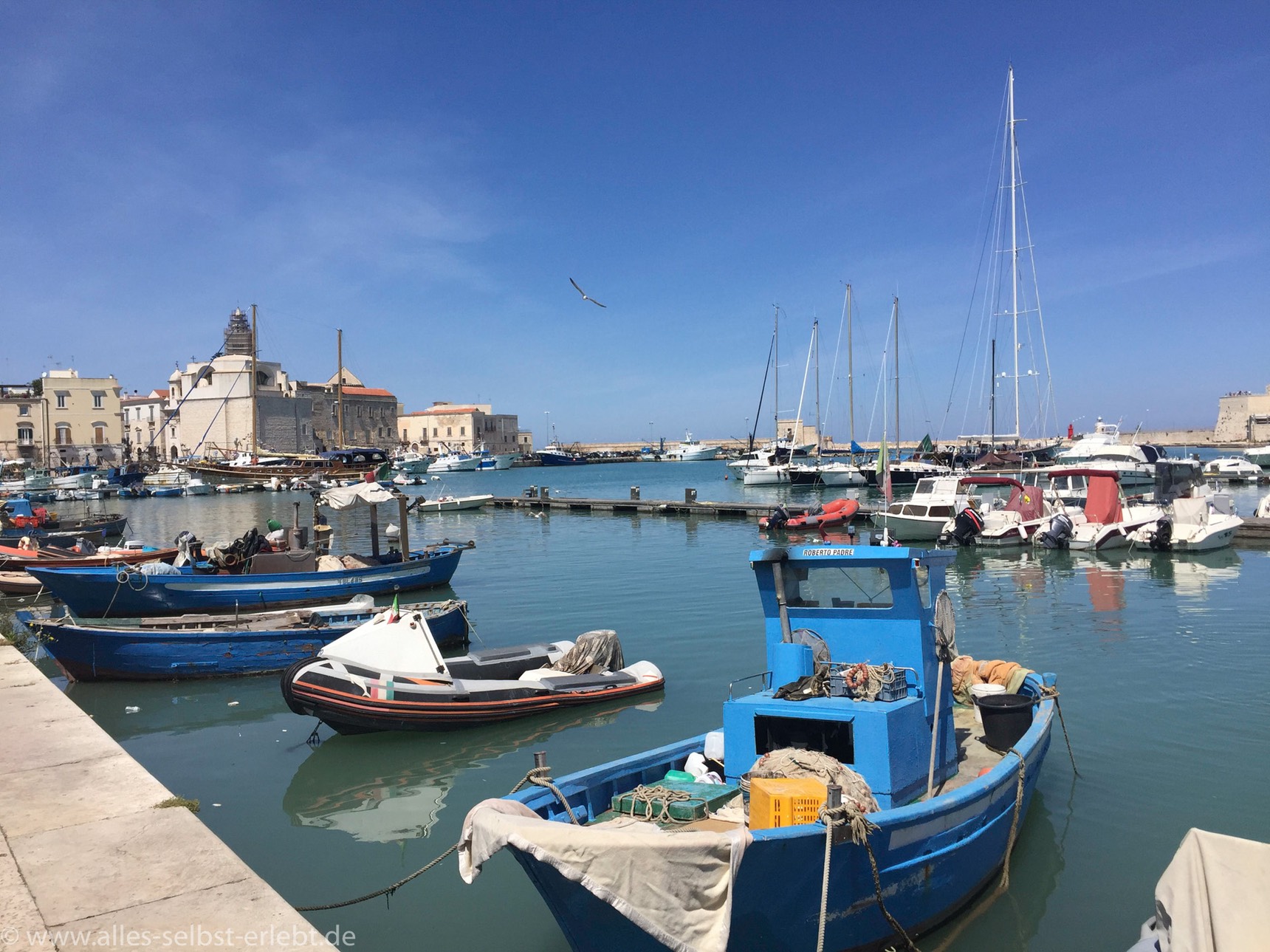 Am 1. Mai ist in Italien alles unterwegs, was Beine hat. Das wissen wir schon von unserem Sizilienurlaub 2013 und sind vorbereitet. In Trani sind rund um den Hafen Stände mit allerhand Leckereien aufgebaut. Man steht Schlange. Dennoch finden wir etwas abseits echte Stilleben: mit Leuchtturm oder Boot. In den Altstadt-Gässchen geht es beschaulicher zu, hier sind wir fast allein.