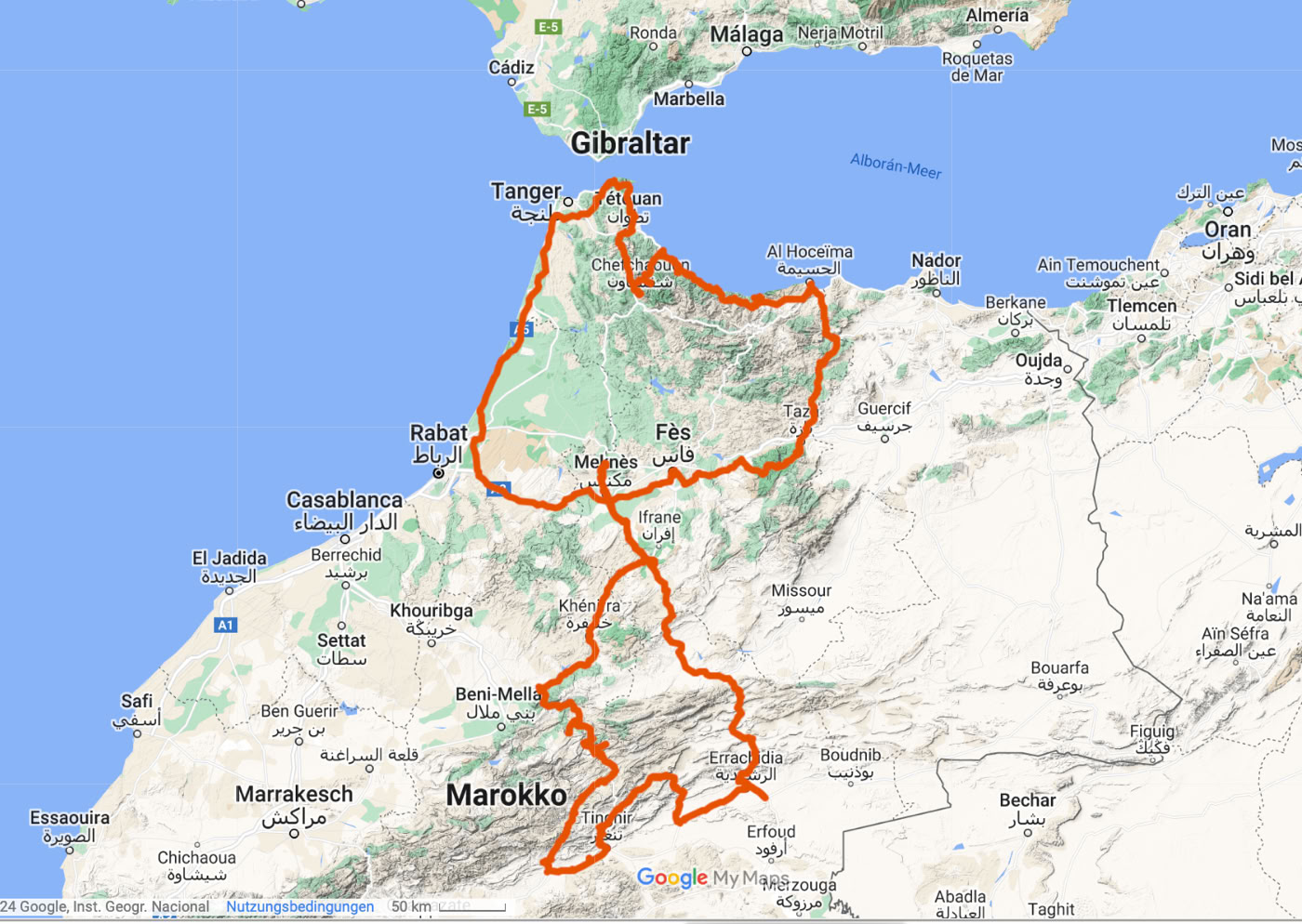 Von dort beginnen wir unsere Reise im Uhrzeigersinn: Tétouan - Rif - Mittelmeer - Mittlerer und Hoher Atlas. Wir schaffen es bis an den Rand der Sahara.