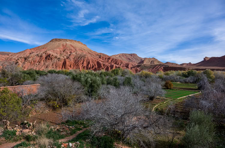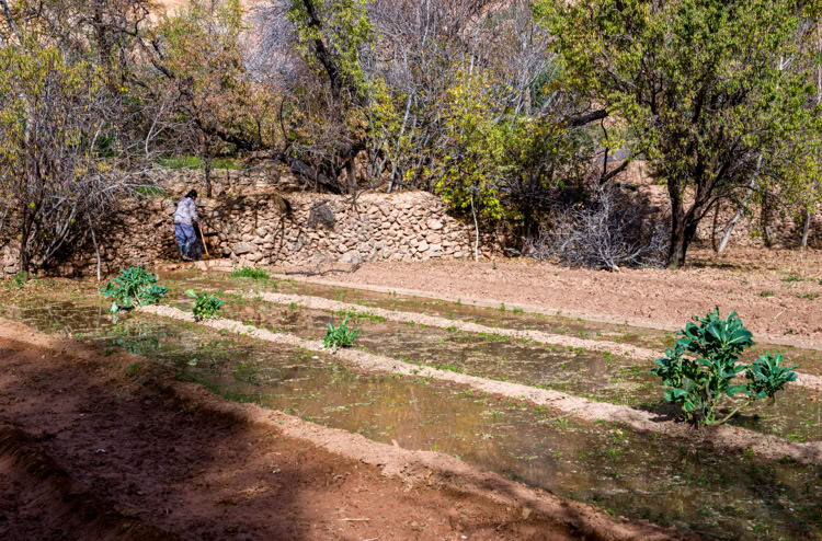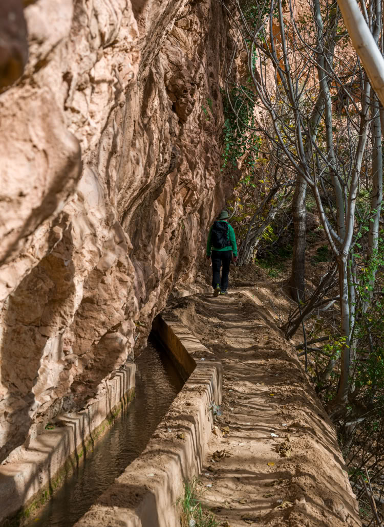 Auch die Mauern der Bewässerungskanäle, aus denen die Feldparzellen abwechselnd geflutet werden, fungieren als Wanderweg. Diese Wanderung muss ein Luis-Trenker-Typ auf seiner ersten Marokkoreise vor 50 Jahren erkundet haben …