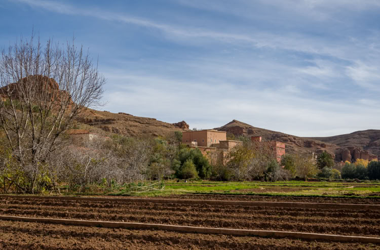 Wie fruchtbar das Tal des Dades ist, sehen wir gleich am Anfang, als wir durch die bewässerten Beete der Gemüsegärten starten und uns gleich das erste Mal verlaufen… Wir lernen, dass als Orientierung Oliven- und Feigenbaumreihen hilfreich sind, die die Felder begrenzen und unterteilen. Der Weg verläuft auf den angehäuften Wällen zwischen den Feldern, damit man keine nassen Füße bekommt.