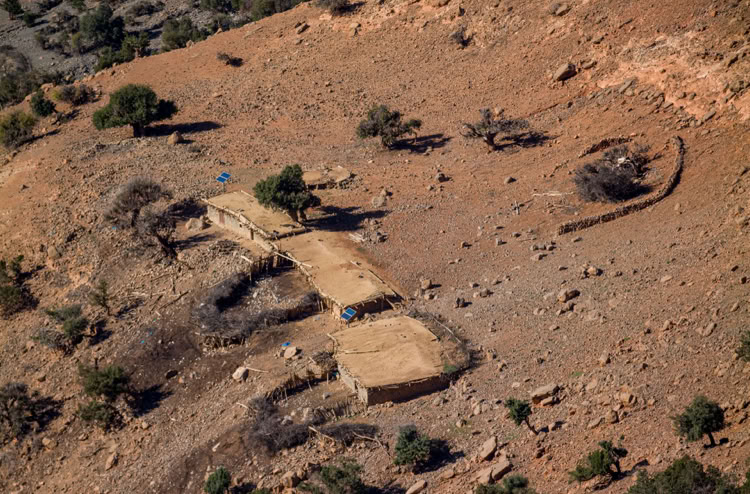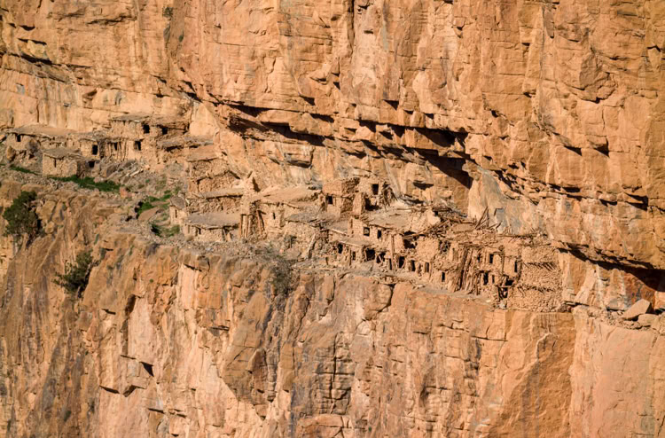 Wir besuchen die Felsenspeicher (agadir) Aoujgal im gleichnamigen Canyon. Der Blick in den Canyon an sich ist die 20 km lange Anfahrt wert, der Anblick der an die Felswand geklebten Speicherbauten erst recht.