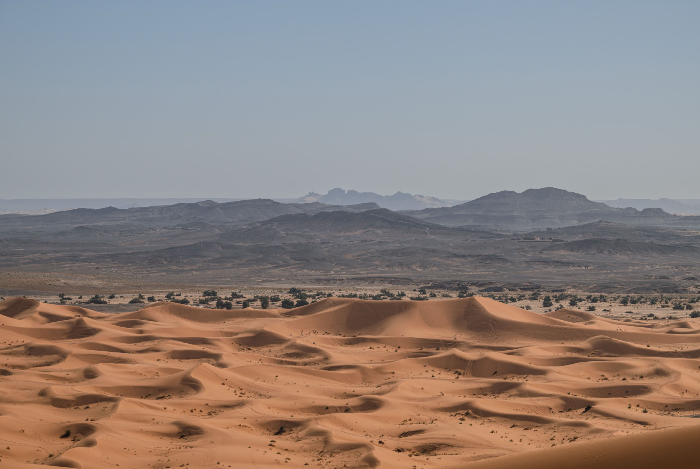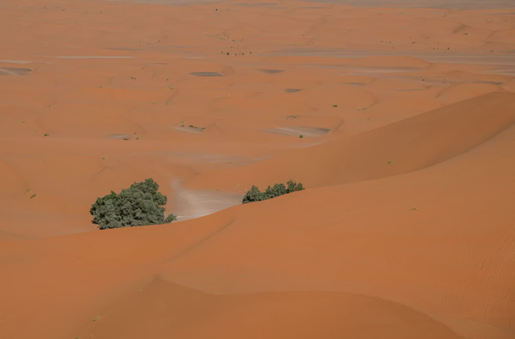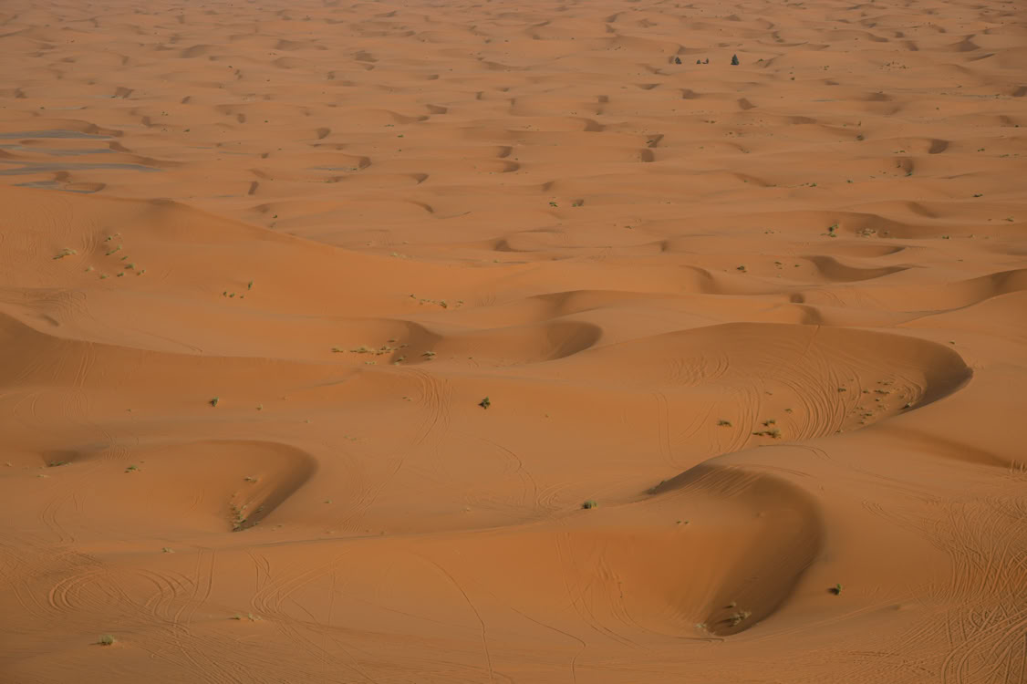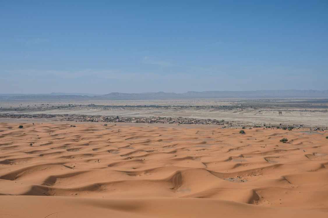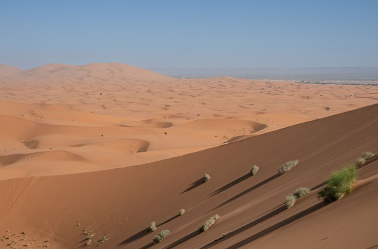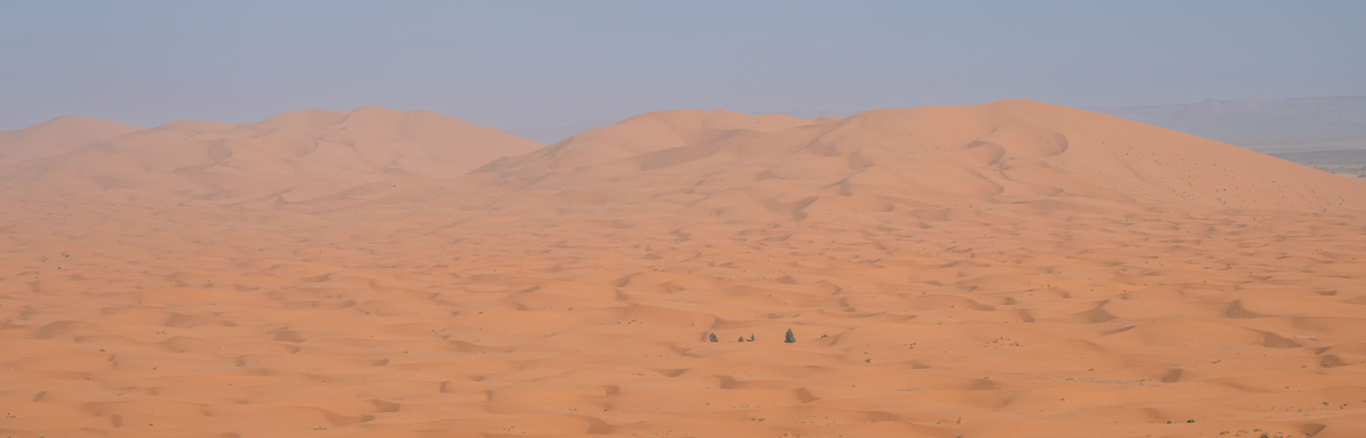 *Der Erg Chebbi ist eine ziemlich überschaubere, gerade mal fünf mal zwanzig Kilometer große Dünenlandschaft. Sitzt man auf der Grande Dune sieht man seine Grenzen, von Städtchen bzw. Touristencamps „umzäunt“. Ein bisschen weckt das Bild die Assoziation an einen großen Sandkasten. Die Dünen sind großartig, aber wir finden, dass man die unendliche Weite der Sahara hier noch nicht erfühlen kann.
