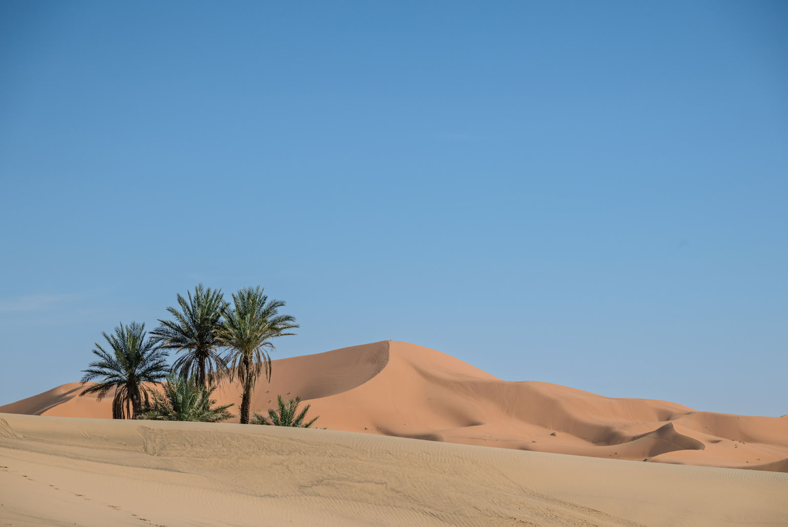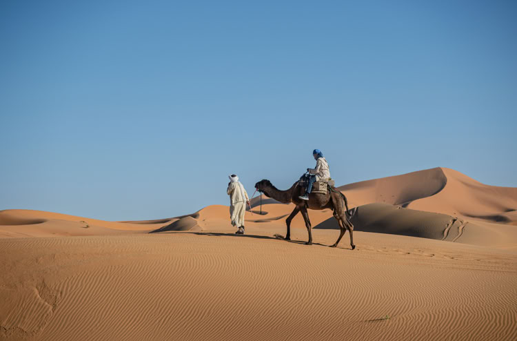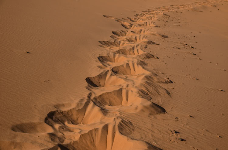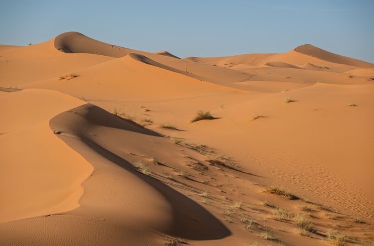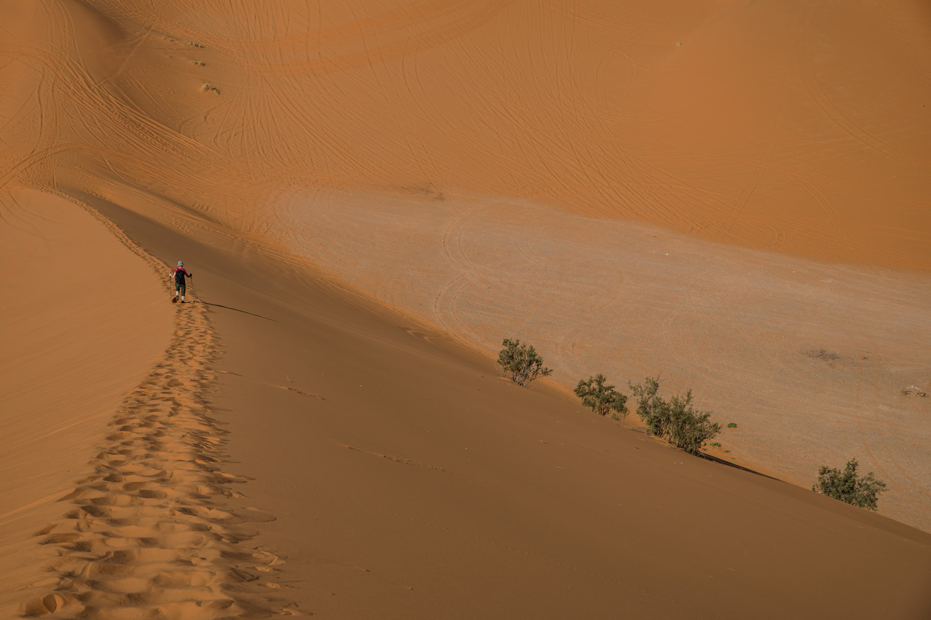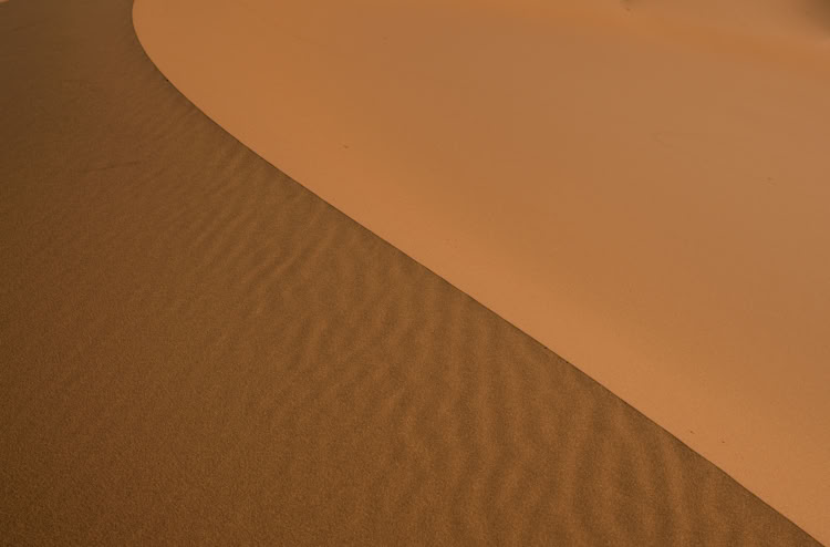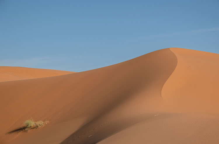 Tagsüber verlassen wir diesen einsamen Ort und erwandern im Erg Chebbi* mal irgendeine namenlose und mal die Grande Dune de Merouga mit immerhin 150 Metern, die höchste Düne. Witzig ist, als wir am höchsten Punkt der Düne stehen, sind wir laut Karte noch 30 Meter von dem Gipfel entfernt. Man erfährt hautnah, wie die Dünen sich mit dem Wind ständig verändern und sieht welch grandiose Landschaft daraus um uns herum geformt wurde.