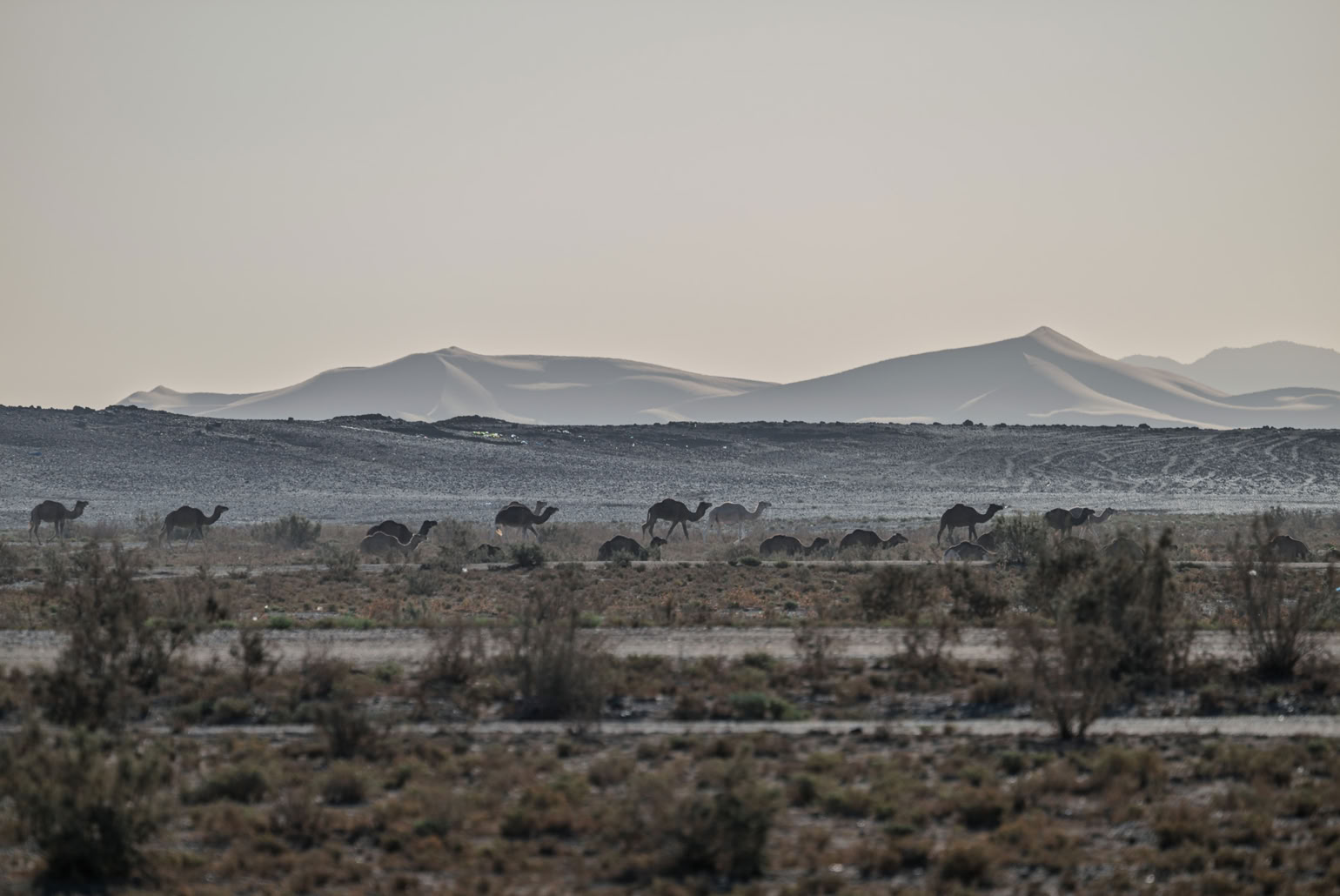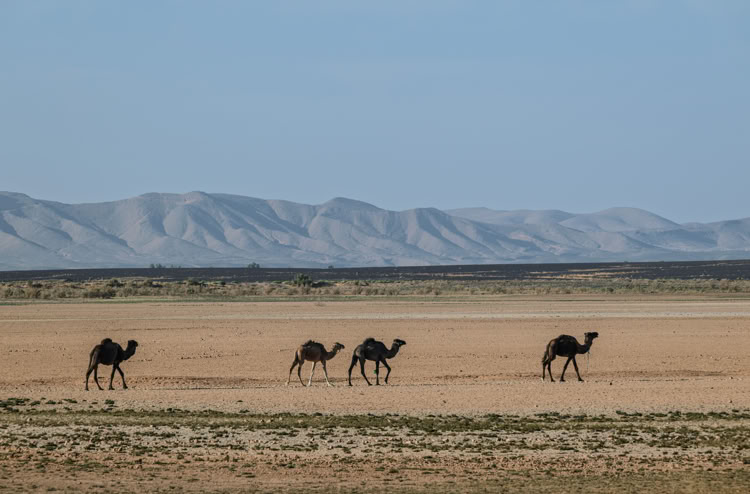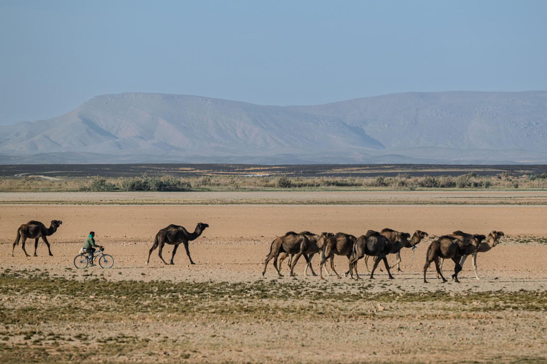 Und zwei Hirten ziehen mit ihrer Dromedarherde vorbei, einer auf dem Fahrrad!