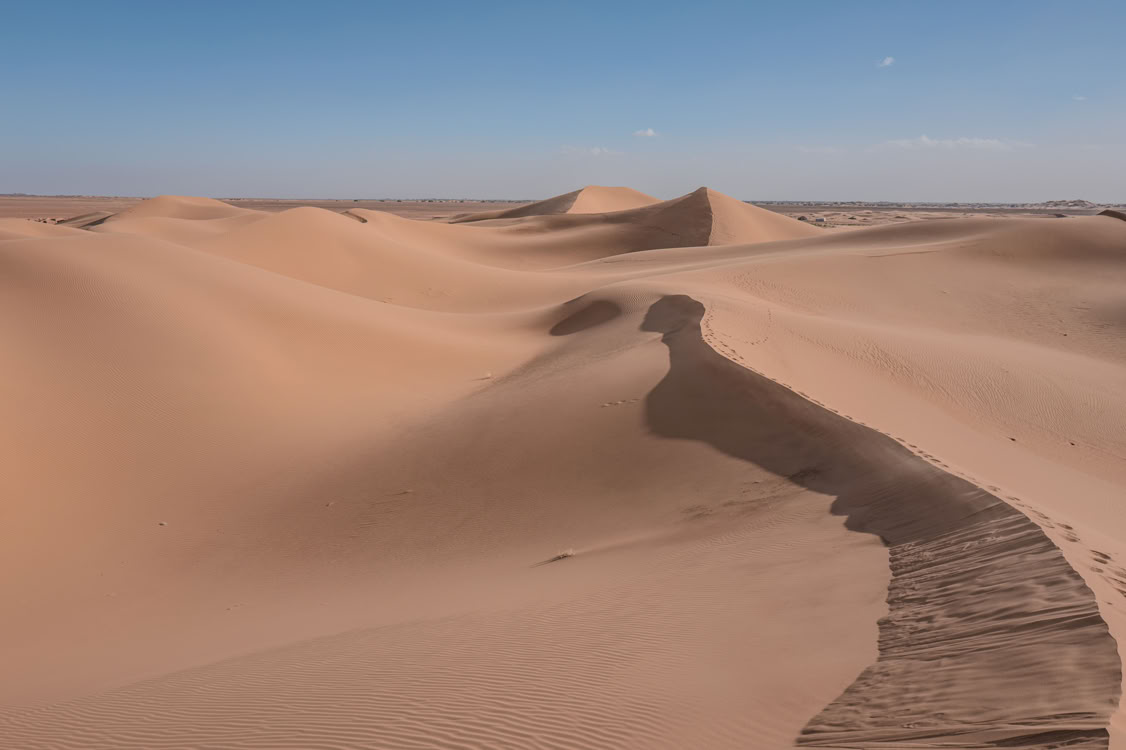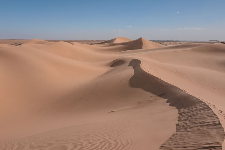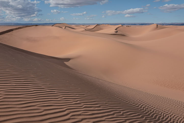 Die Dünen des Erg Lihoudi haben schwarze Kämme. Feinster schwarzer Sand zeichnet diese Linien in die Natur.