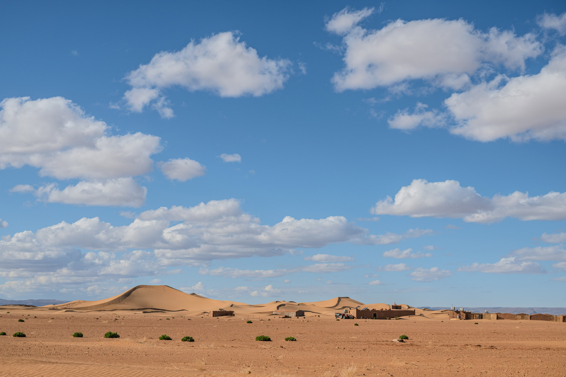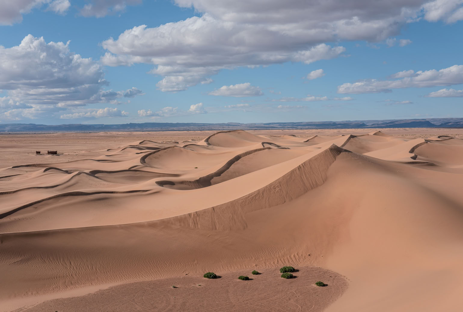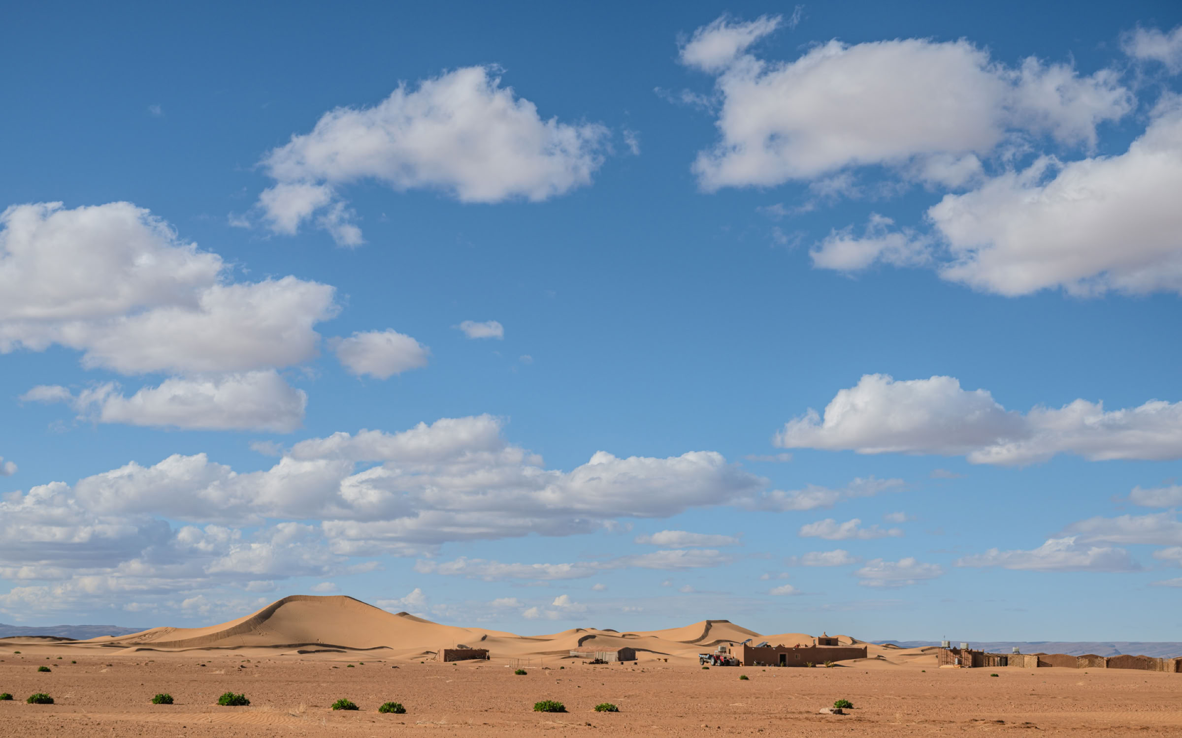 Nur zehn Kilometer Luftlinie von M’Hamid entfernt liegt der winzige Erg Lihoudi, nicht mehr als ein überdimensionaler Sandkasten, circa ein Kilometer breit und zwei bis drei Kilometer lang. Da darf man echt gespannt sein, ob das nicht ein Witz ist. Ist es nicht! Die Lihoudi-Sanddünen sind traumhaft schön und vor allem sind wir allein, als wir die hügelige Sandlandschaft auf- und abwandern. Keine einzige Fußspur vor uns. Man traut sich kaum, die schwarz-beigen Kunstwerke zu zerstören.
