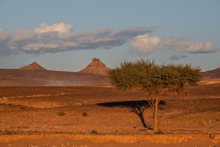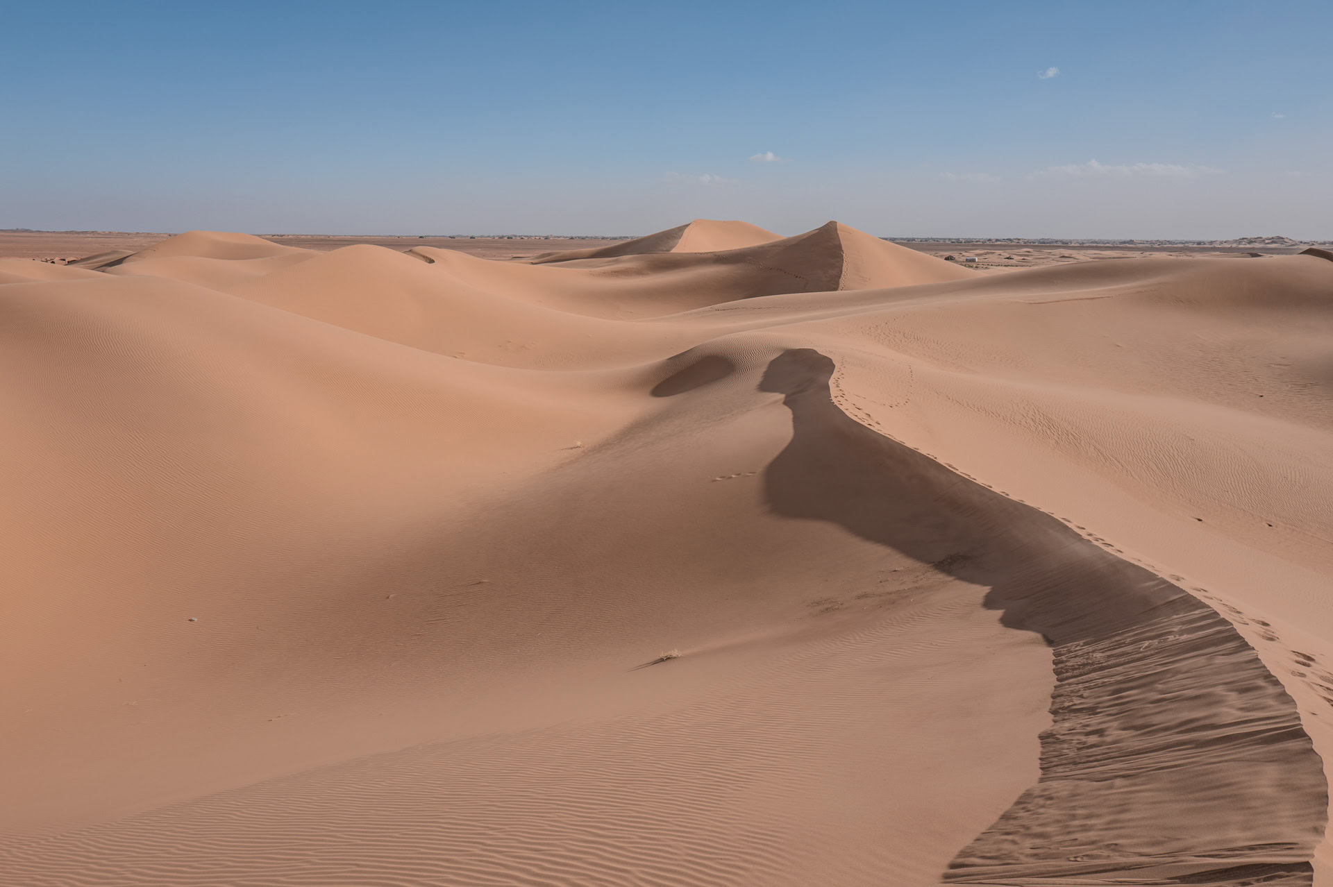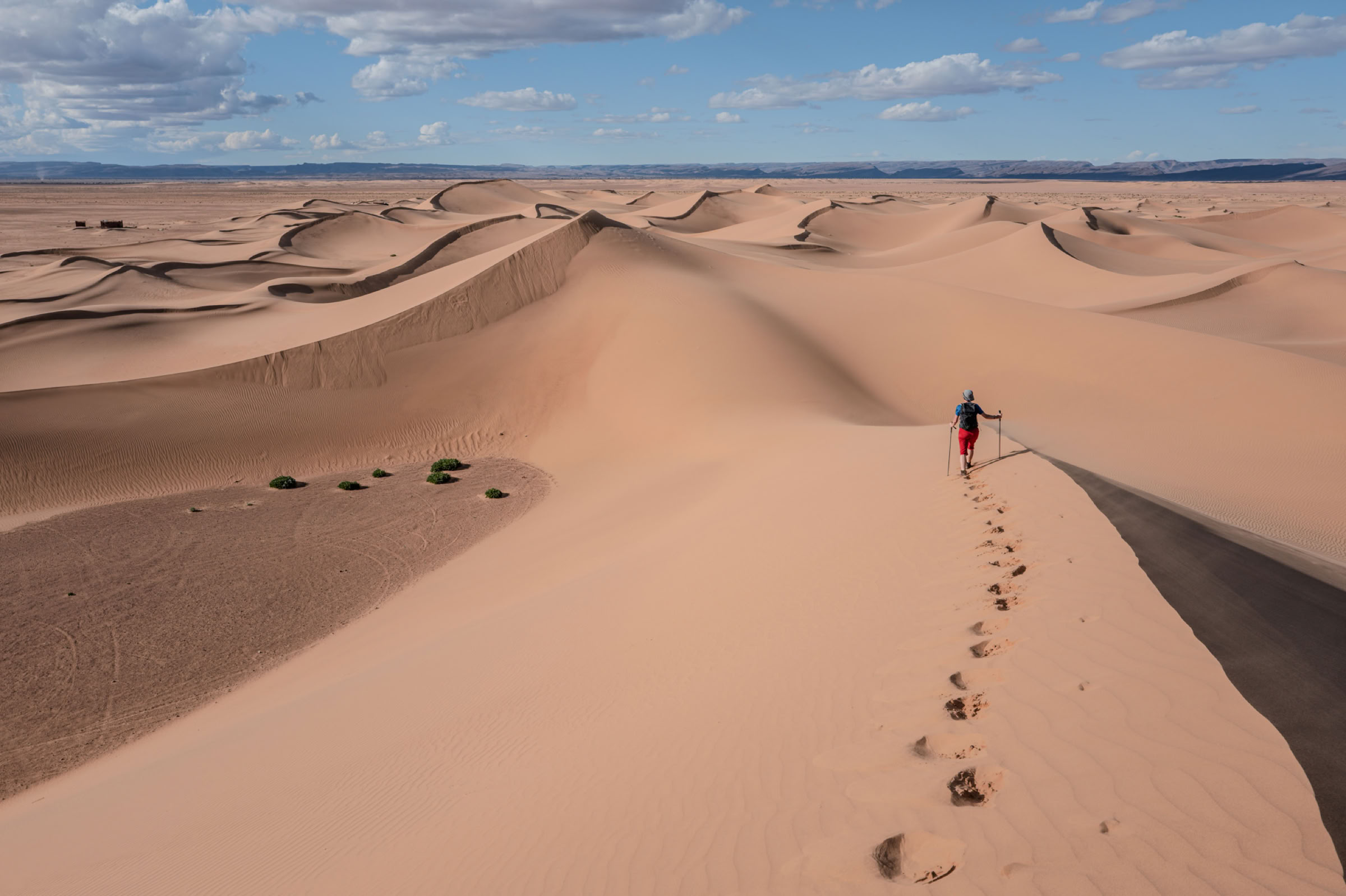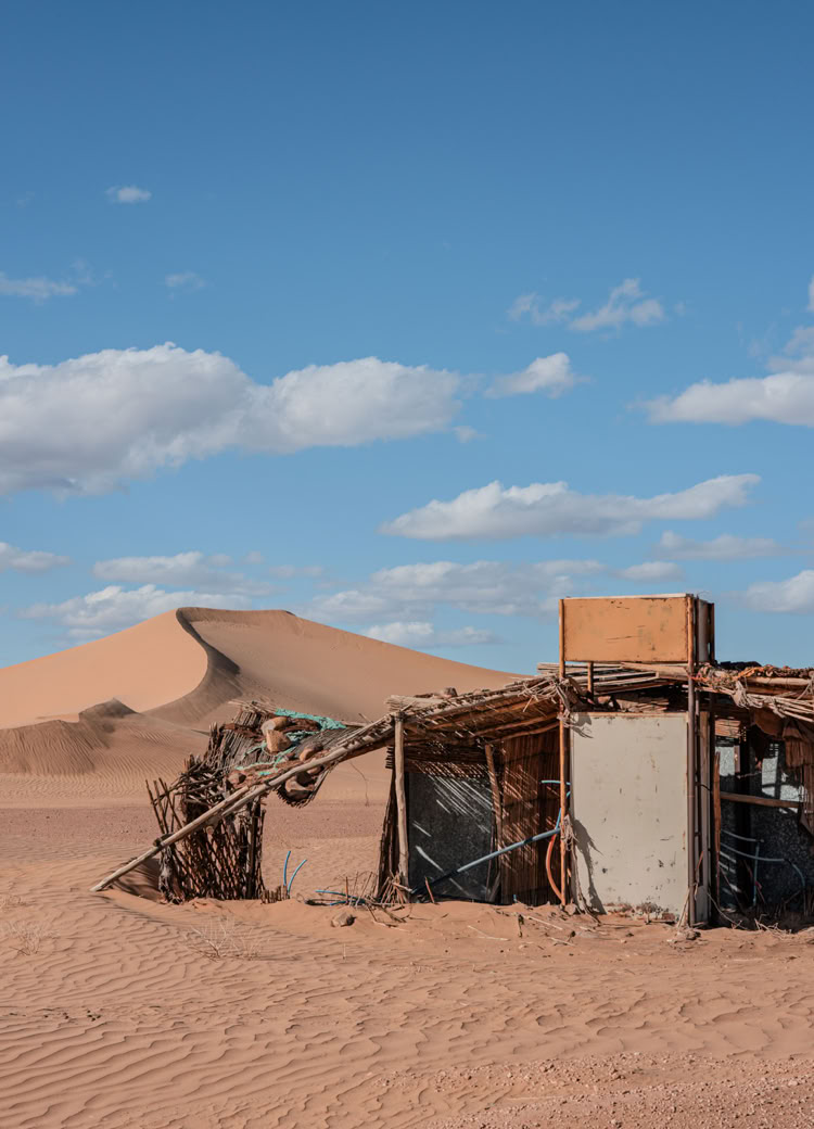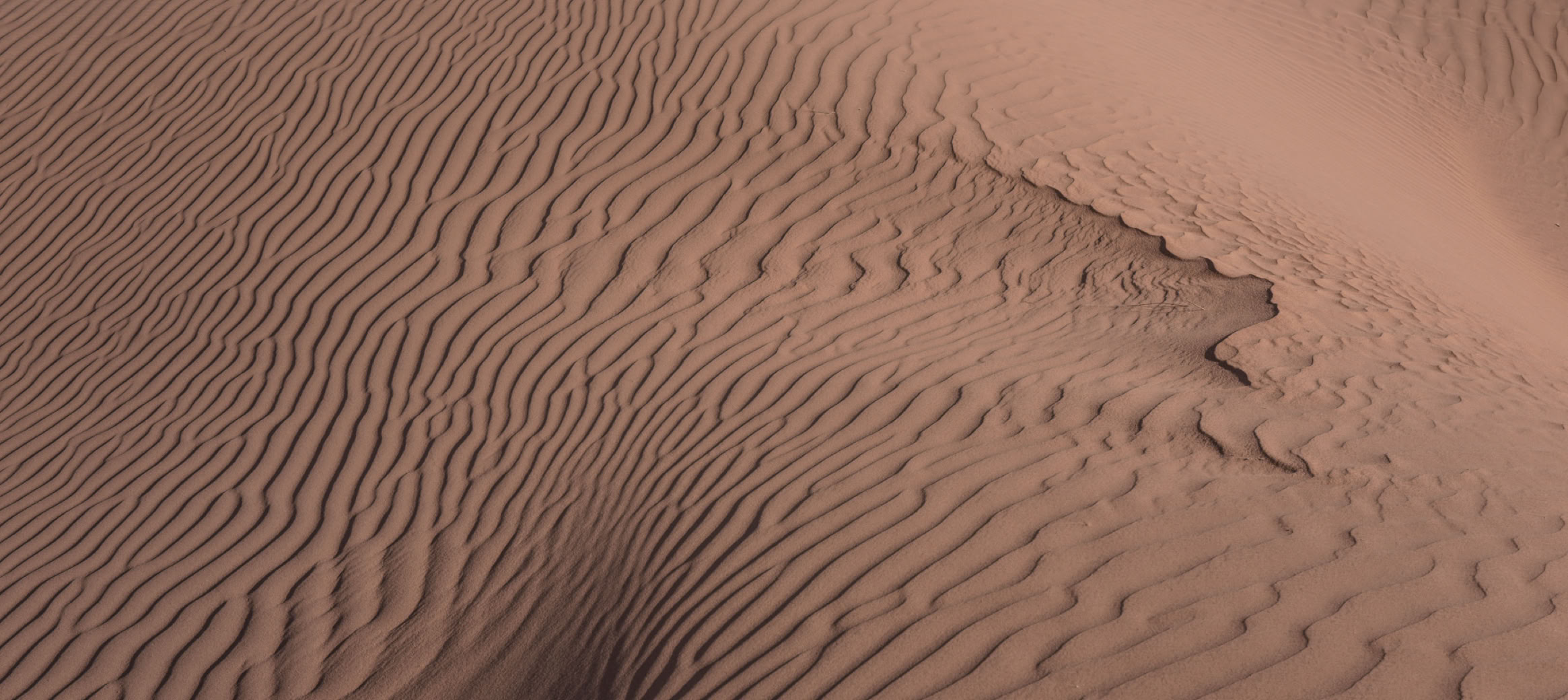 Nur zehn Kilometer Luftlinie von M’Hamid entfernt liegt der winzige Erg Lihoudi, nicht mehr als ein überdimensionaler Sandkasten, circa ein Kilometer breit und zwei bis drei Kilometer lang. Da darf man echt gespannt sein, ob das nicht ein Witz ist. Ist es nicht! Die Lihoudi-Sanddünen sind traumhaft schön und vor allem sind wir allein, als wir die hügelige Sandlandschaft auf- und abwandern. Keine einzige Fußspur vor uns. Man traut sich kaum, die schwarz-beigen Kunstwerke zu zerstören.