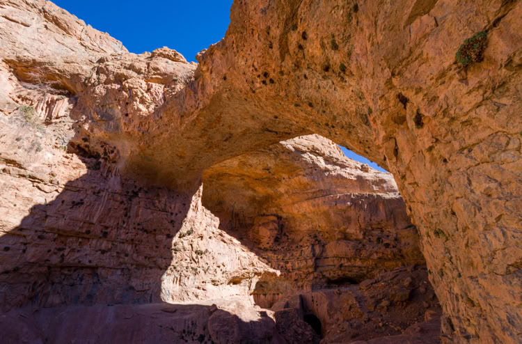Die letzten zwei Kilometer zum Parkplatz an der Felsenbrücke Akhiamn sind schon sehr rumpelig, aber die Mühe lohnt sich! Noch einen Kilometer Gekraxel im fast trockenen Flussbett am zur Zeit etwas ärmlichen Wasserfall vorbei und wir stehen unter der riesigen Felsenbrücke. Sie präsentiert sich perfekt in der Nachmittagssonne - was ein gewaltiger Anblick!