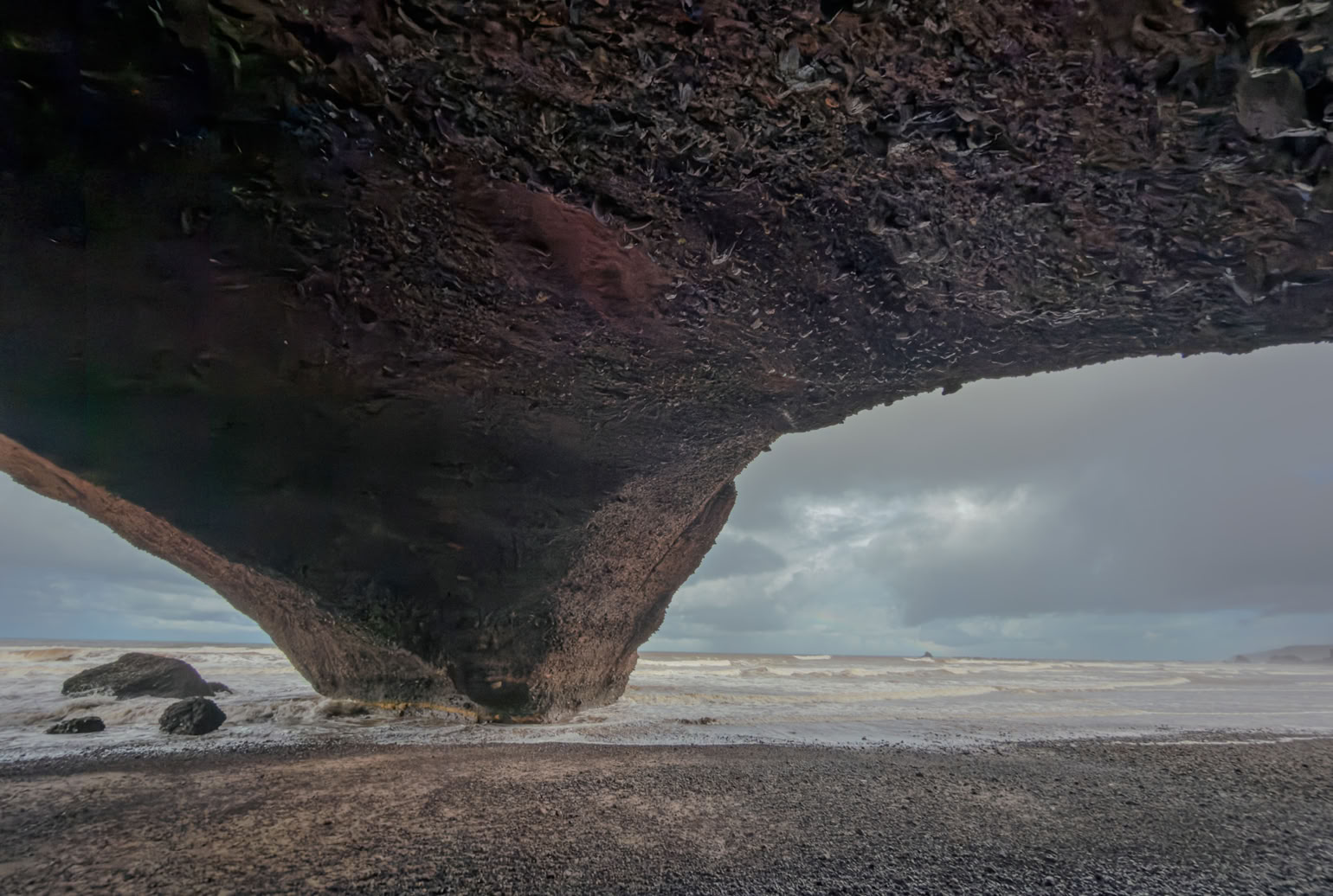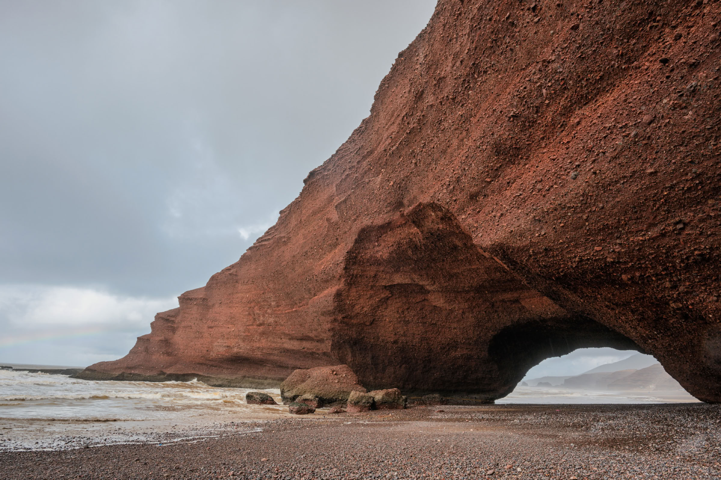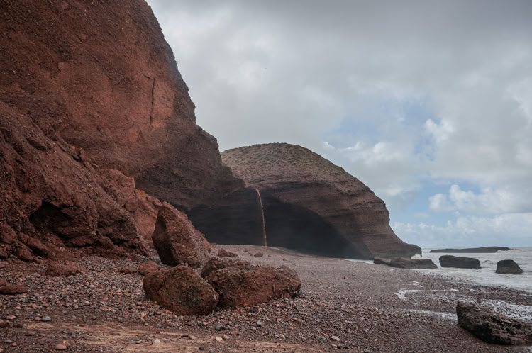 Einen letzten Regenschauer für die nächsten zwei Wochen sitzen wir unter der Felsenbrücke von Legzira aus.