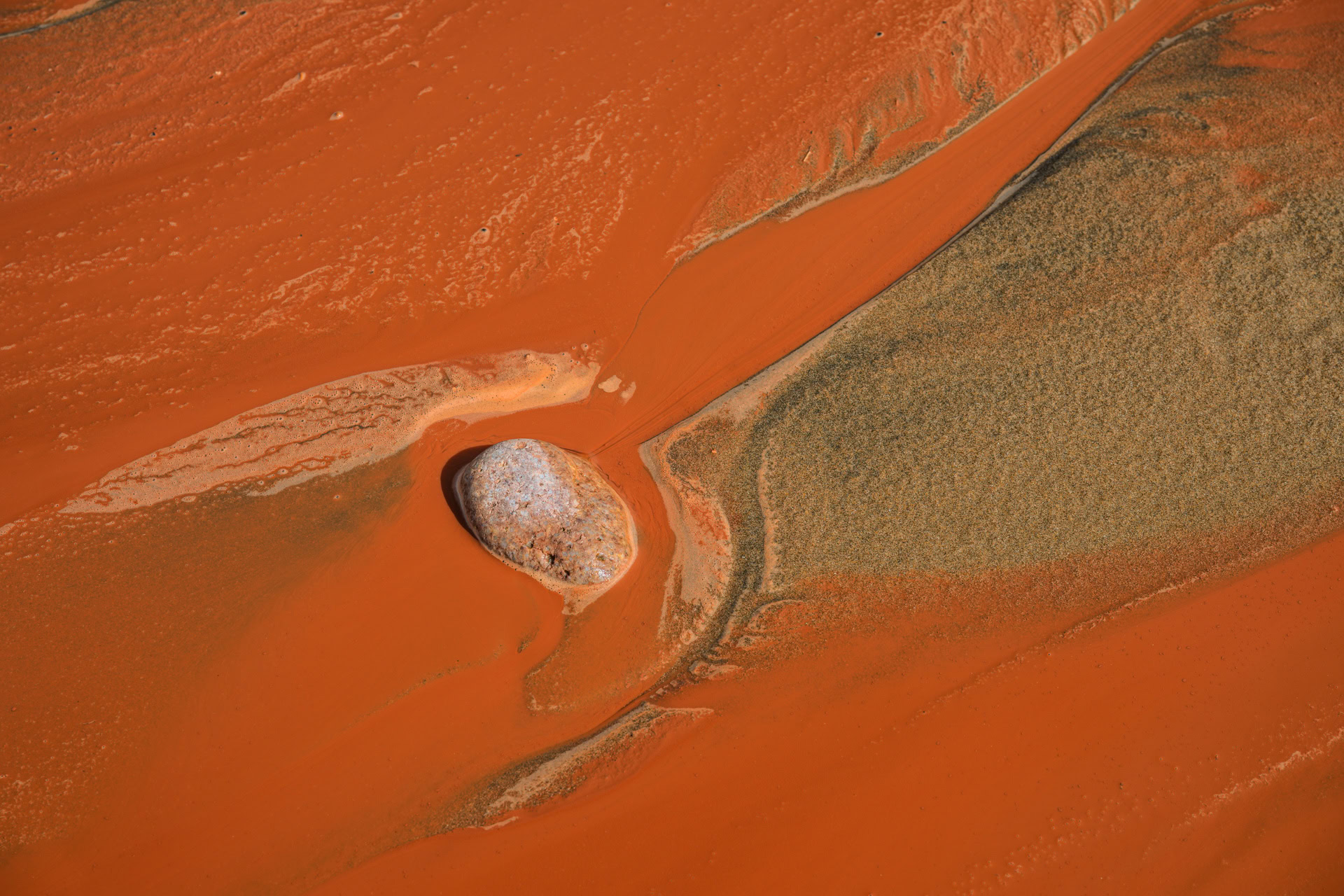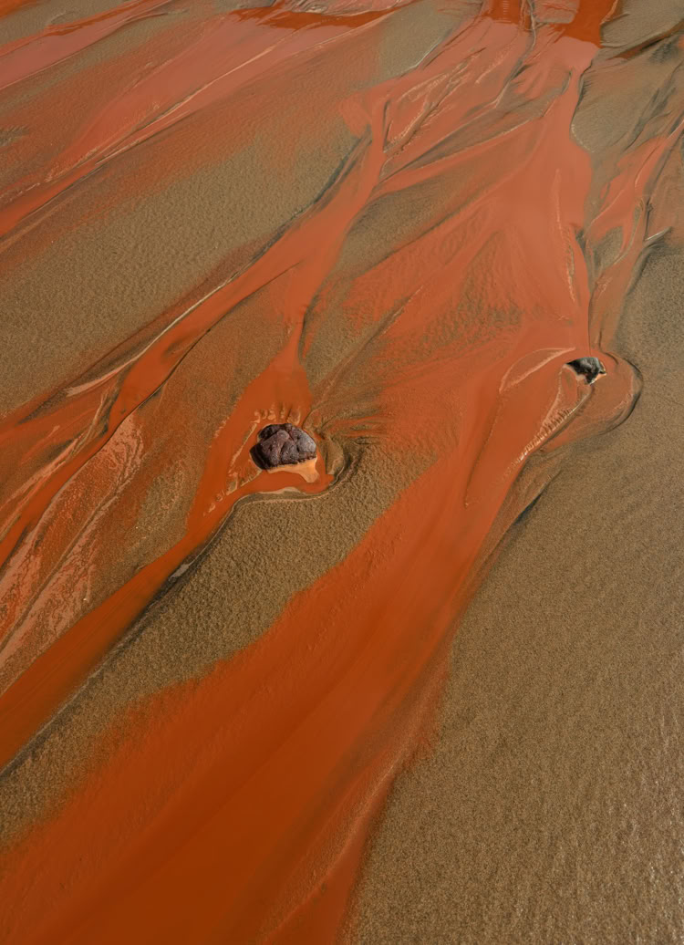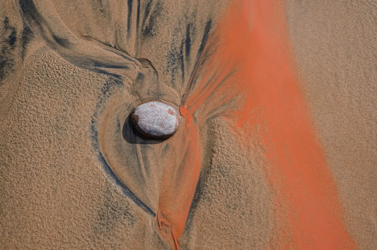 Bei heftigem Sturm und einem letzten Regenschauer machen wir den Spaziergang zur Felsenbrücke. Von oben laufen die braunen Bäche die Felsenwand herunter, es hat sich sogar ein Wasserfall gebildet. Das sieht man nicht alle Tage. Absolut einmalig und „künstlerisch wertvoll“ sind die Kunstwerke, die die Lehmbäche im Sand bilden.