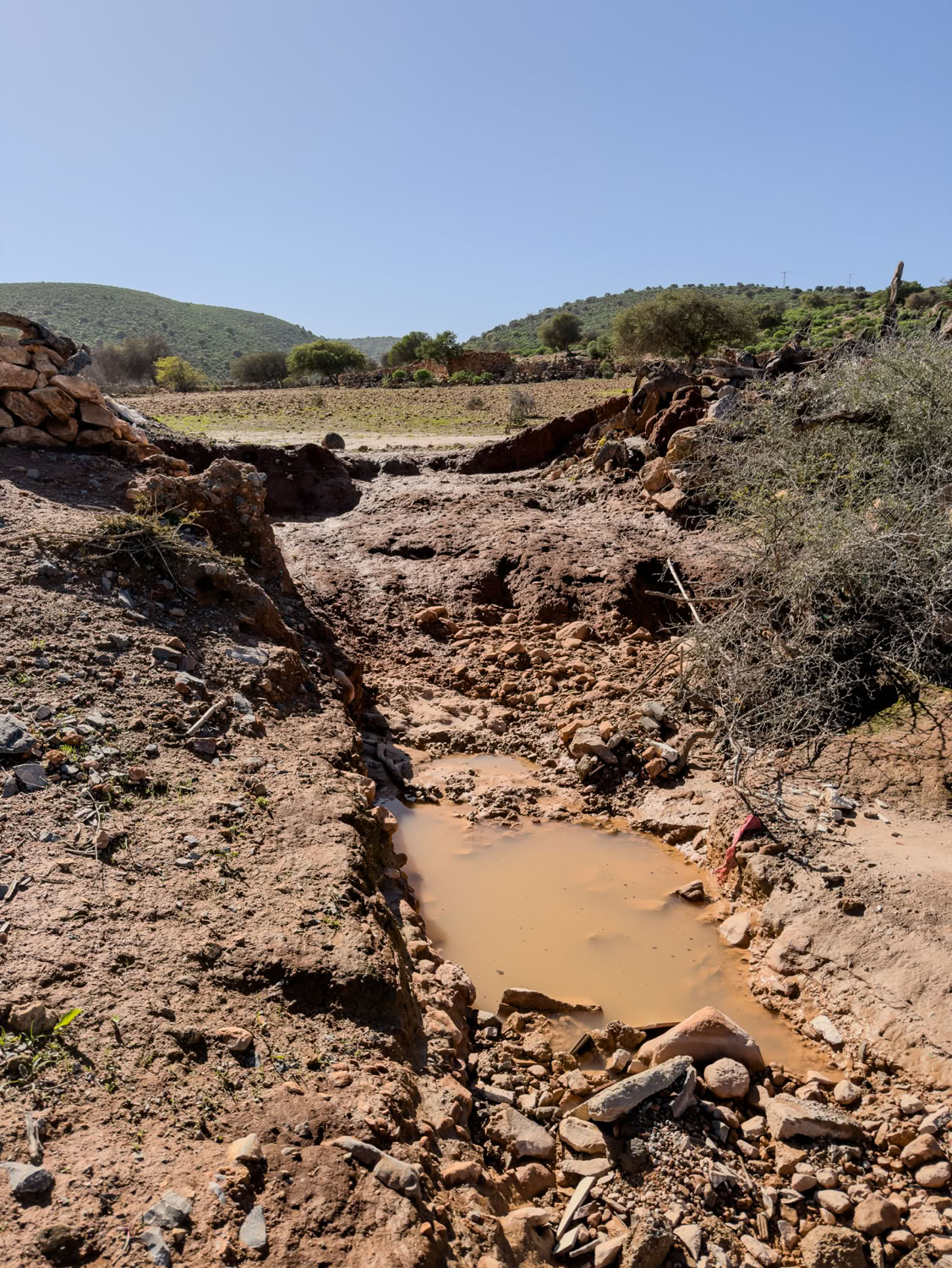 Wir wähnten uns ab Tiznit wettertechnisch in sicherem Gebiet, aber das Wasser kam wohl aus den Bergen und hat uns eingeholt! Drei Tage später ist übrigens auf der Hauptstraße nichts mehr von Schlamm oder Geröll zu sehen. Alles weggeräumt. Unser Bach ist auch wieder versiegt, zurück bleibt ein ausgewaschener Graben.